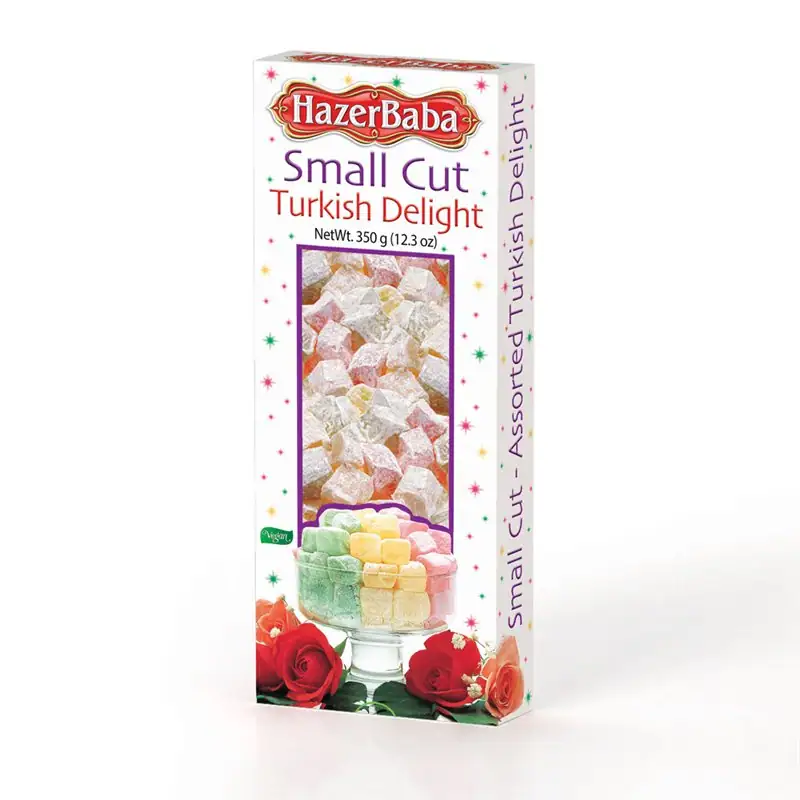This Fruit-Flavored Turkish Delight is crafted with a blend of sugar, corn starch, and water, enhanced with natural identical flavors such as rose, lemon, and mint. The product includes food colorings (E 163, Turmeric, E 100, E 141ii) and citric acid as an acidity regulator. It may contain traces of other tree nuts, gluten, and sesame. Proudly made in Turkey.