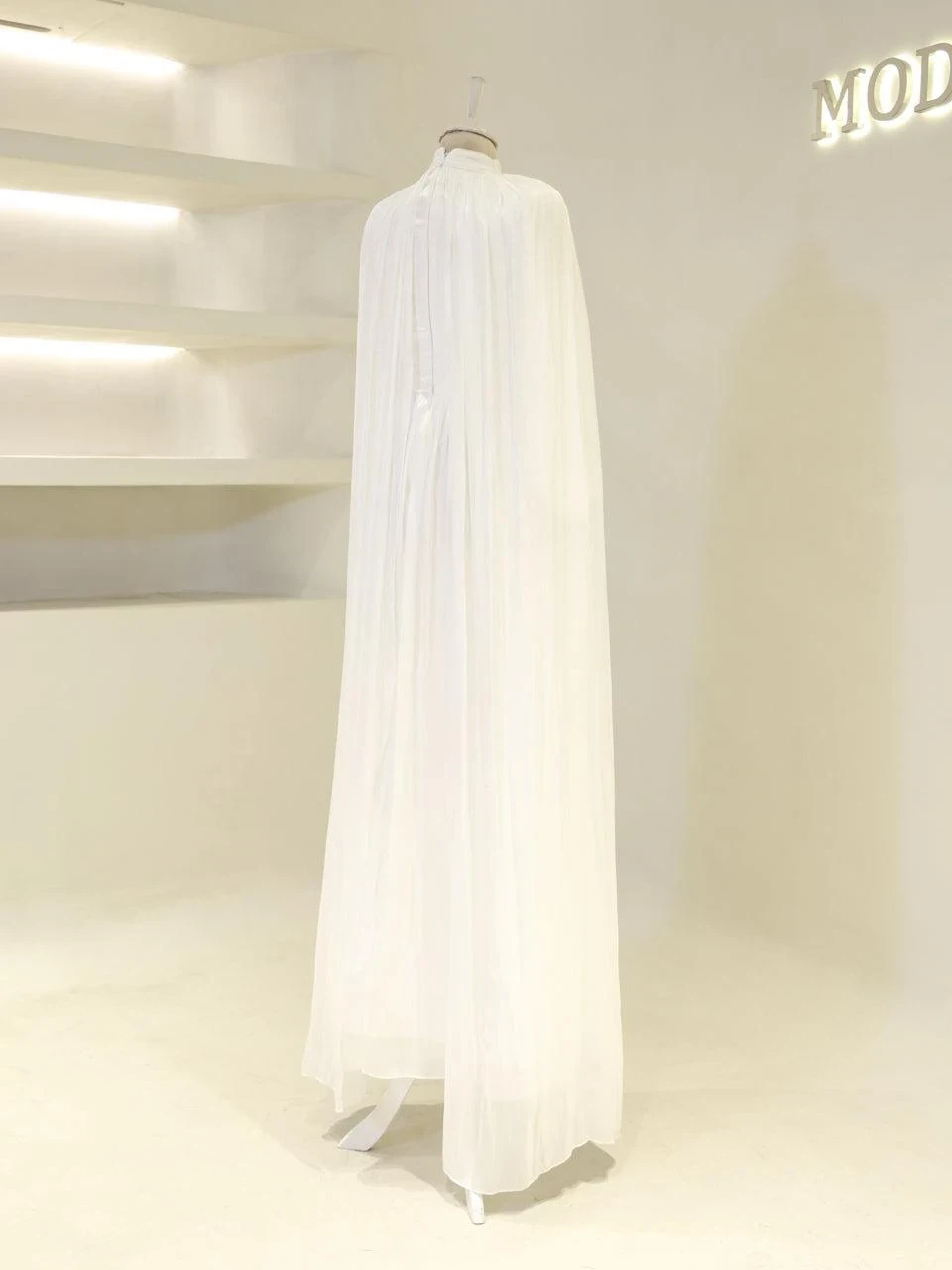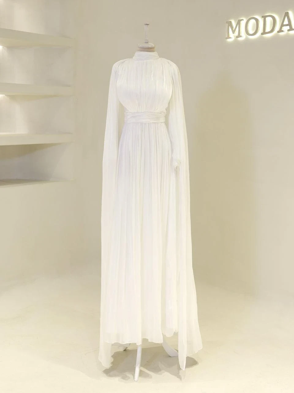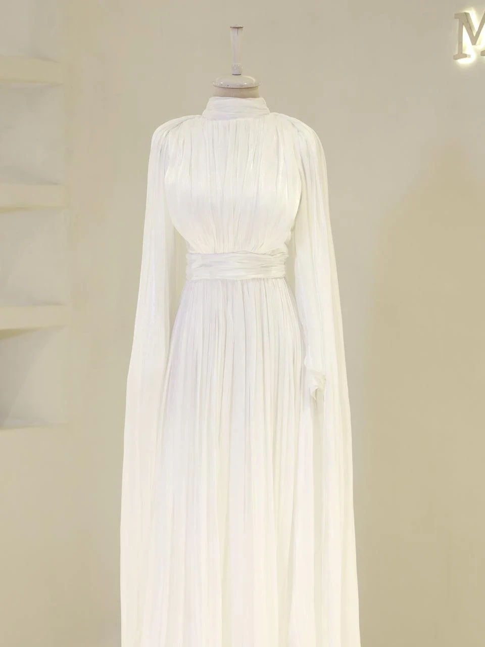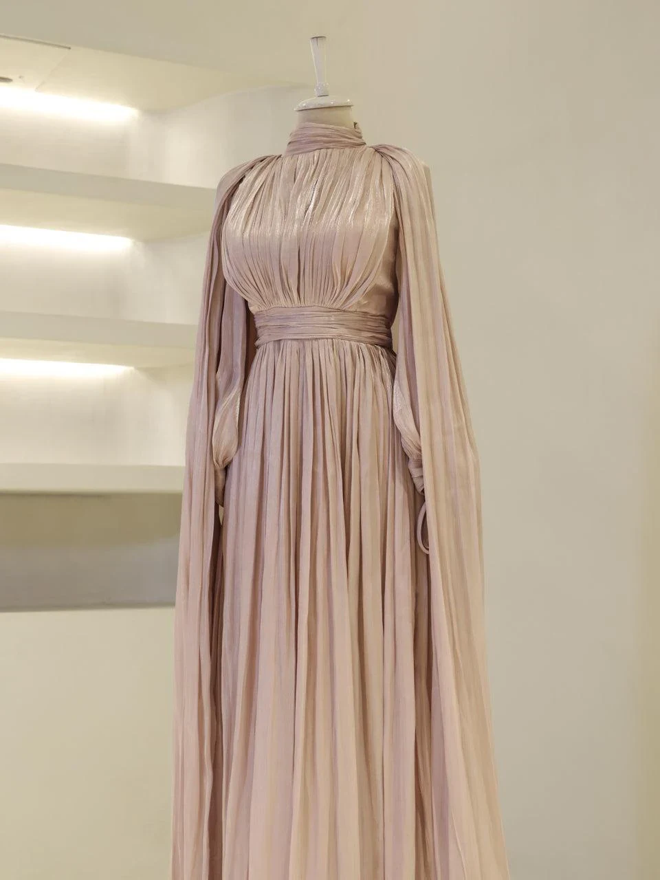 The Galadriel Modest Evening Dress is crafted to provide a perfect fit, with an average length of 160 cm. Made from quality orchid fabric, this dress includes a back zipper for ease of wear. It features a built-in chest pad for added comfort and support. The dress is designed with distinctive cape details on both shoulders and tie details on the sleeves. It is fully lined and has a flared skirt for a graceful appearance.