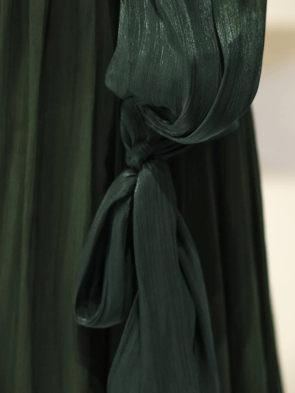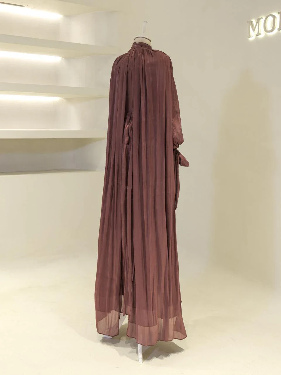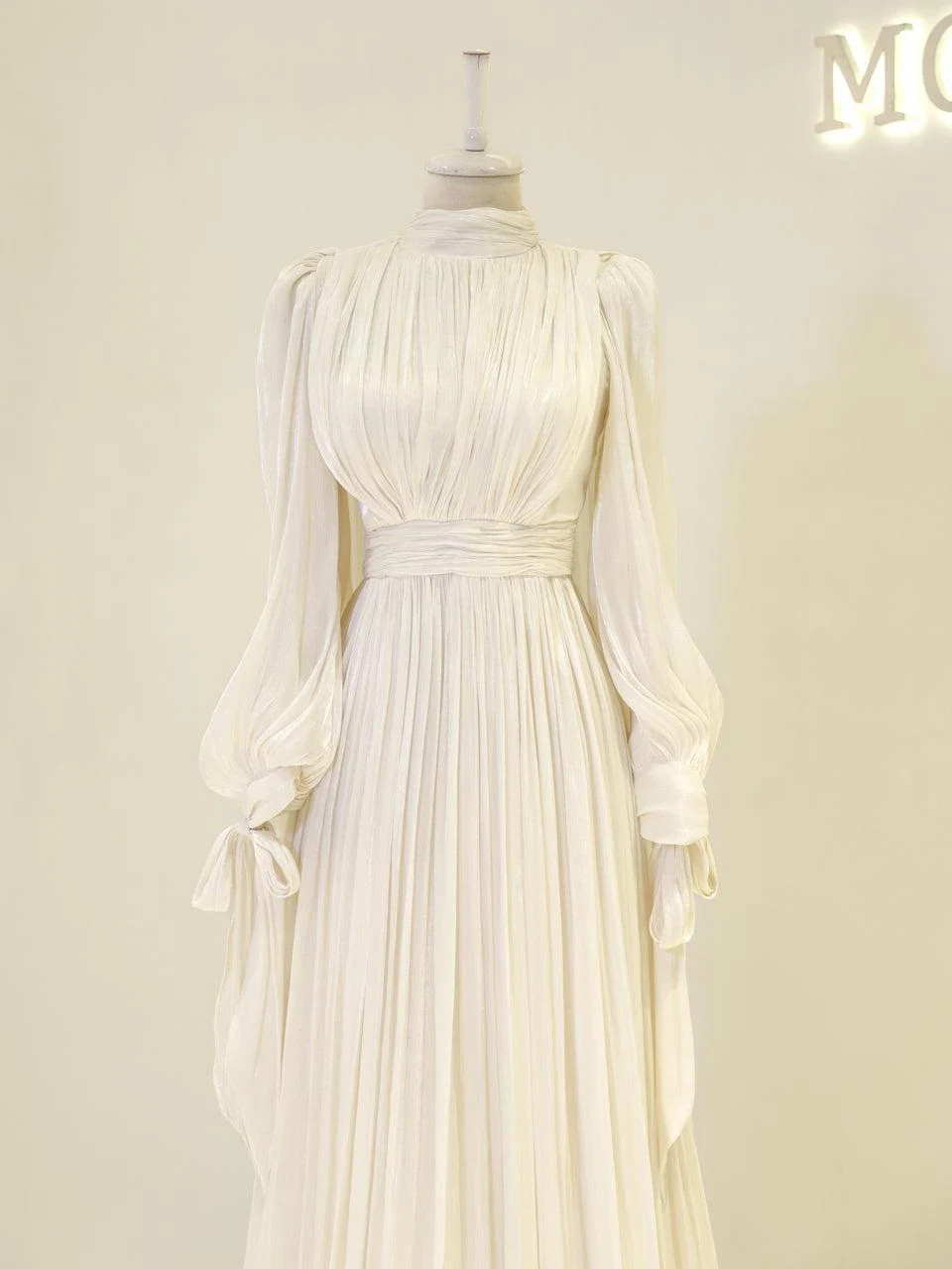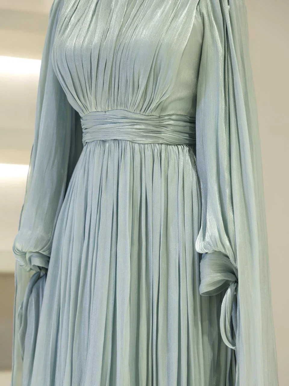 The Galadriel Modest Evening Dress is crafted to provide a perfect fit, with an average length of 160 cm. Made from quality orchid fabric, this dress includes a back zipper for ease of wear. It features a built-in chest pad for added comfort and support. The dress is designed with distinctive cape details on both shoulders and tie details on the sleeves. It is fully lined and has a flared skirt for a graceful appearance.