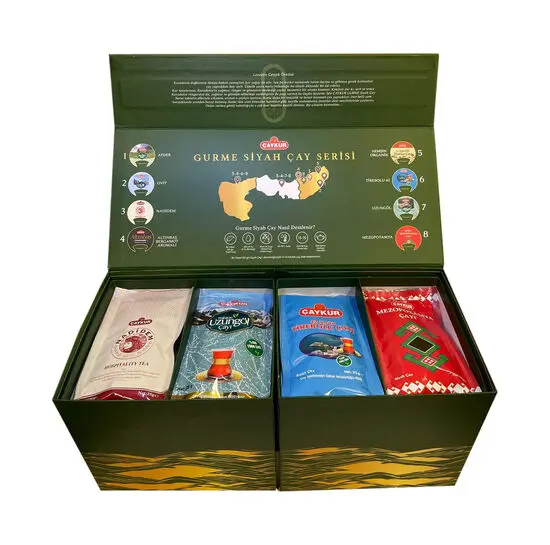 The Gift Gourmet Tea set from Çaykur includes a selection of different teas, each weighing 25 grams. The set contains five units of Ayder Tea, Ovit Tea, Nadidem Tea, Altınbaş Bergamot Flavored Tea, Hemşin Organic Tea, Tirebolu 42 Tea, Uzungöl Tea, and Mezopotamya Tea. Each carton contains six boxes of this assorted tea collection, making it suitable for gifting or personal enjoyment.