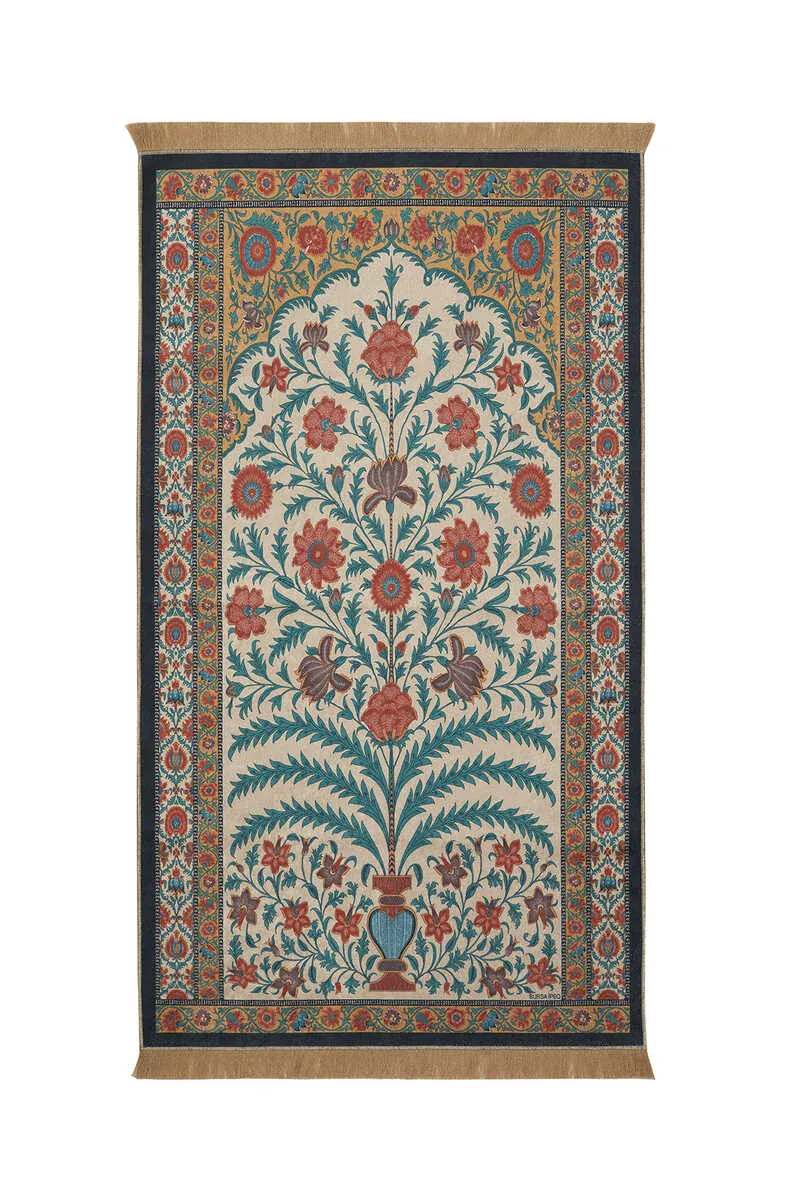 The Gold Kadife Halı Seccade is a prayer rug featuring Turkish motifs and ceramic patterns, designed with a velvet texture for comfort. It measures 65×115 cm and originates from Bursa, Turkey.