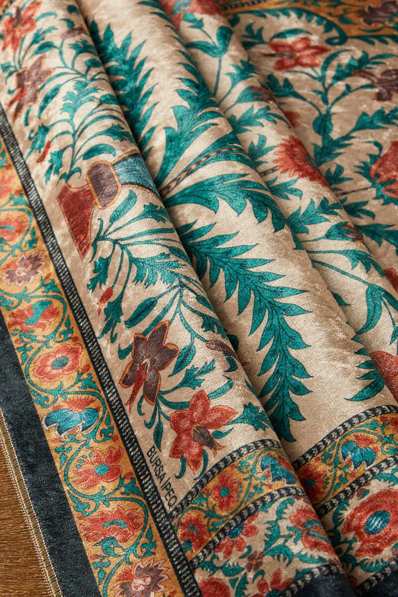 The Gold Velvet Prayer Rug offers a decorative appearance with its Turkish motifs and ceramic-inspired patterns. Crafted in Bursa, Turkey, this rug measures 65×115 cm, providing comfortable use. Its velvet texture adds elegance to any space.