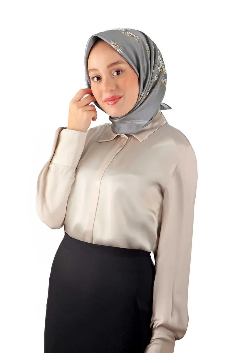 The Gray Daisy Pattern Twill Silk Scarf is a versatile addition to your wardrobe. Crafted in Bursa, Turkey, this scarf features a delicate daisy pattern that adds a touch of nature's elegance to any outfit. With its dimensions of 90 x 90 cm, it offers comfortable wear for various occasions. The use of 100% twill silk ensures a quality feel and appearance.