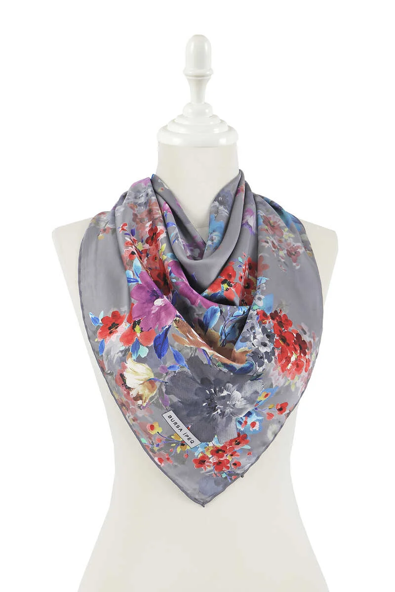 The Gri Sardunya Desen İpeksi Eşarp is a scarf featuring grey geranium patterns on silky rayon fabric, measuring 90×90 cm. It combines vibrant colors with a classic design and is made in Bursa, Turkey.