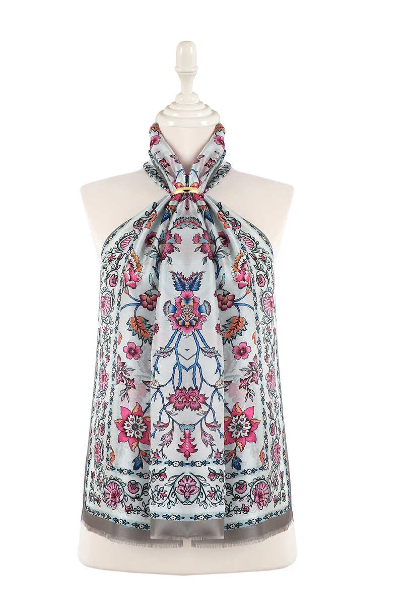 The Gray Lilyum Pattern Voile Silk Scarf combines elegance and sophistication, suitable for both daily use and special occasions. Crafted from lightweight voile silk, it offers a soft touch without discomfort. Measuring 45 x 150 cm, this scarf is easy to style and wear. Originating from Bursa, Turkey, it exemplifies quality craftsmanship.