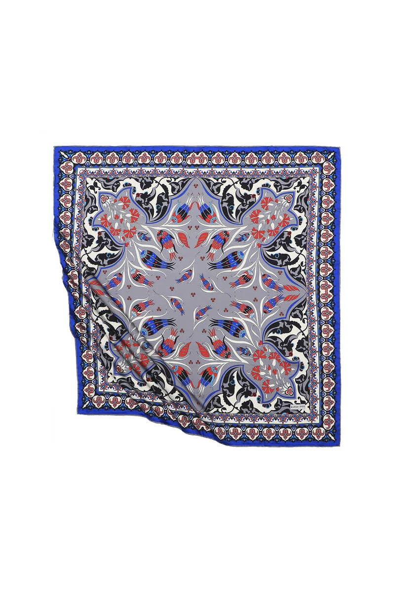 The Gri Türk Motifli Çintemani Karanfil Desen İpeksi Eşarp is a scarf featuring grey Çintemani and carnation patterns on silky rayon fabric. It measures 90×90 cm and originates from Bursa, Turkey.