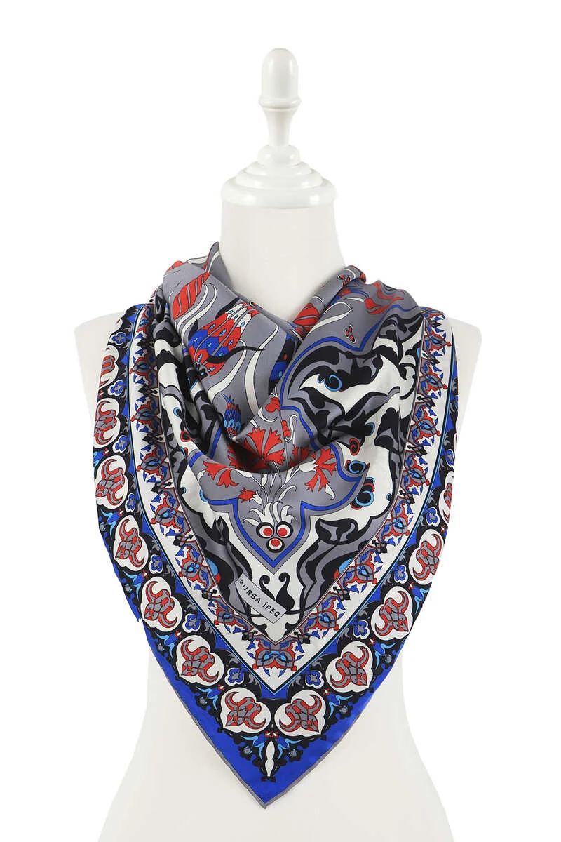 The Gray Turkish Motif Çintemani Carnation Scarf features a blend of classic and vibrant design elements. Made from 100% silk-like rayon, it offers a smooth texture and lively colors. The scarf measures 90×90 cm, providing ease of styling for various occasions. Originating from Bursa, Turkey, this accessory adds a touch of energy to any outfit with its floral motifs.
