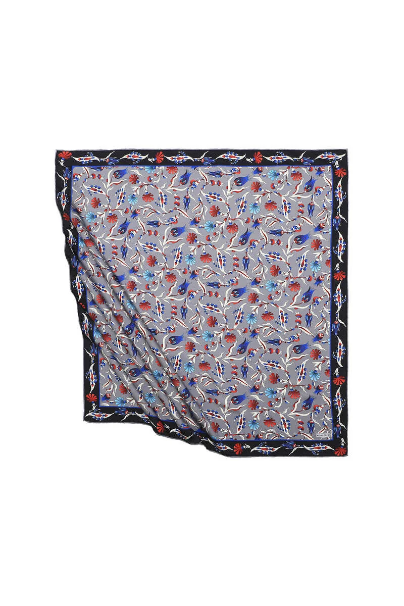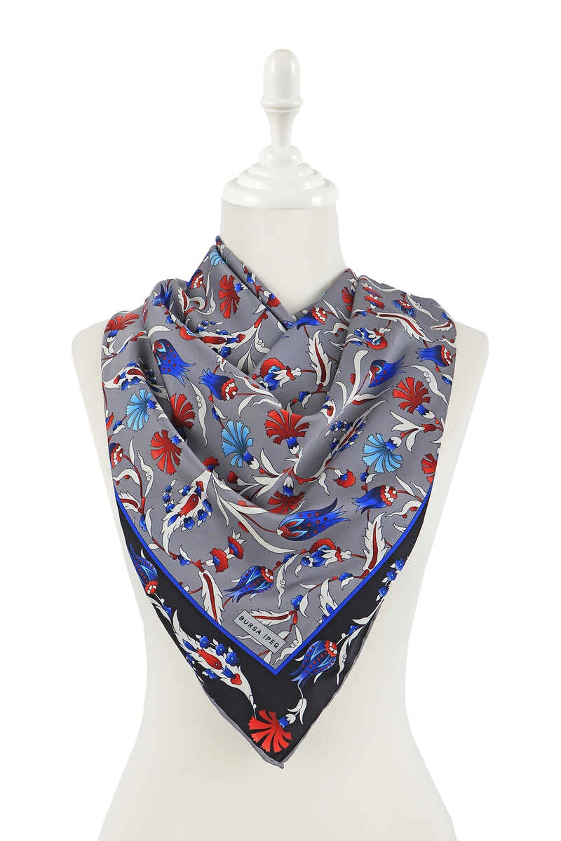 The Gri Türk Motifli Karanfil Lale Desen İpeksi Eşarp features a design of gray carnation and tulip patterns on silky rayon fabric. Measuring 90×90 cm, this scarf is made in Bursa, Turkey.