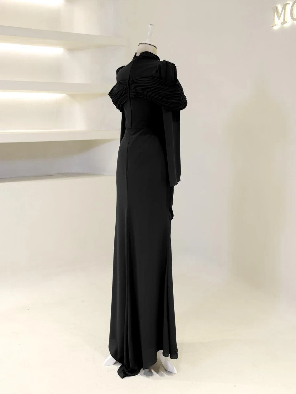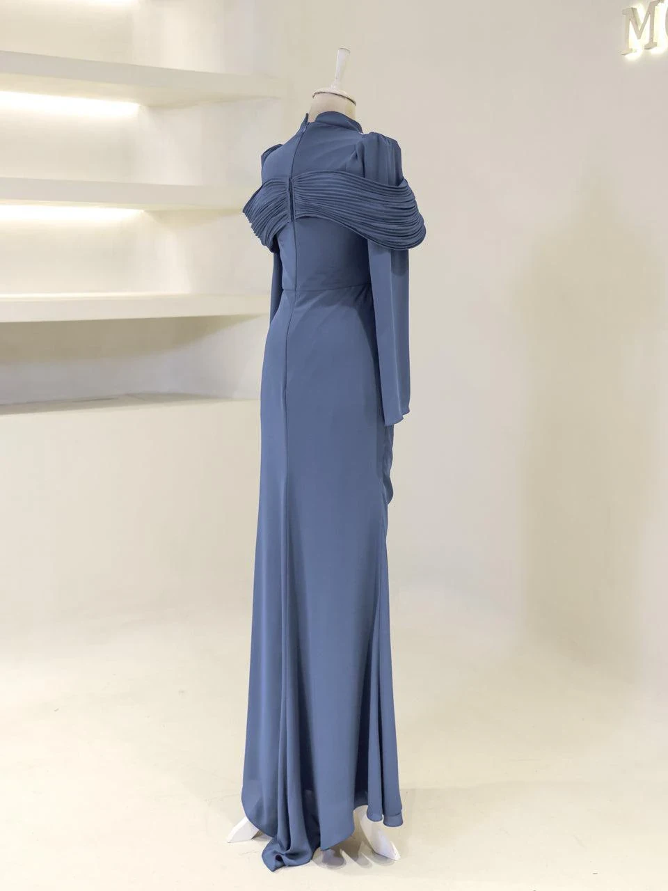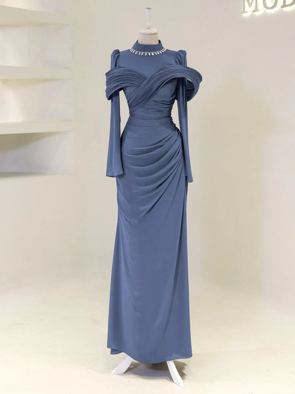The Grazie Modest Evening Dress is designed with a full-length of 160 cm, crafted from crepe fabric. It features a lining for added comfort and a back zipper for easy wear. The dress includes a built-in bust pad and decorative adhesive embellishments. Its fishtail design adds a touch of sophistication.