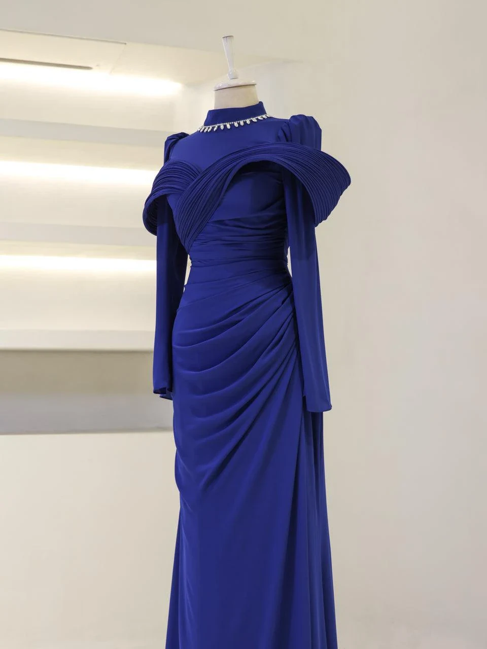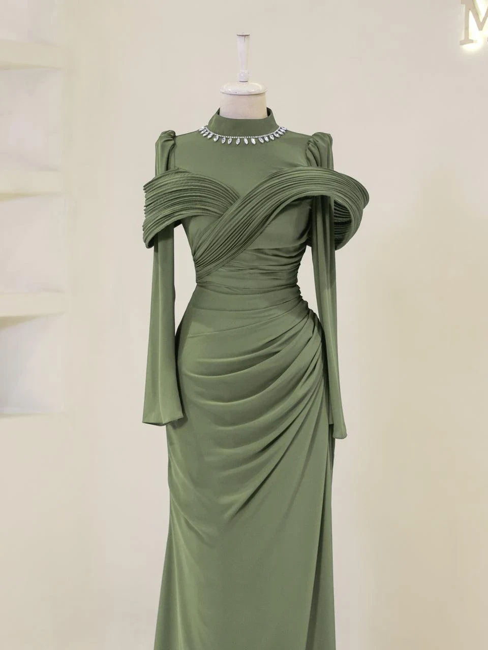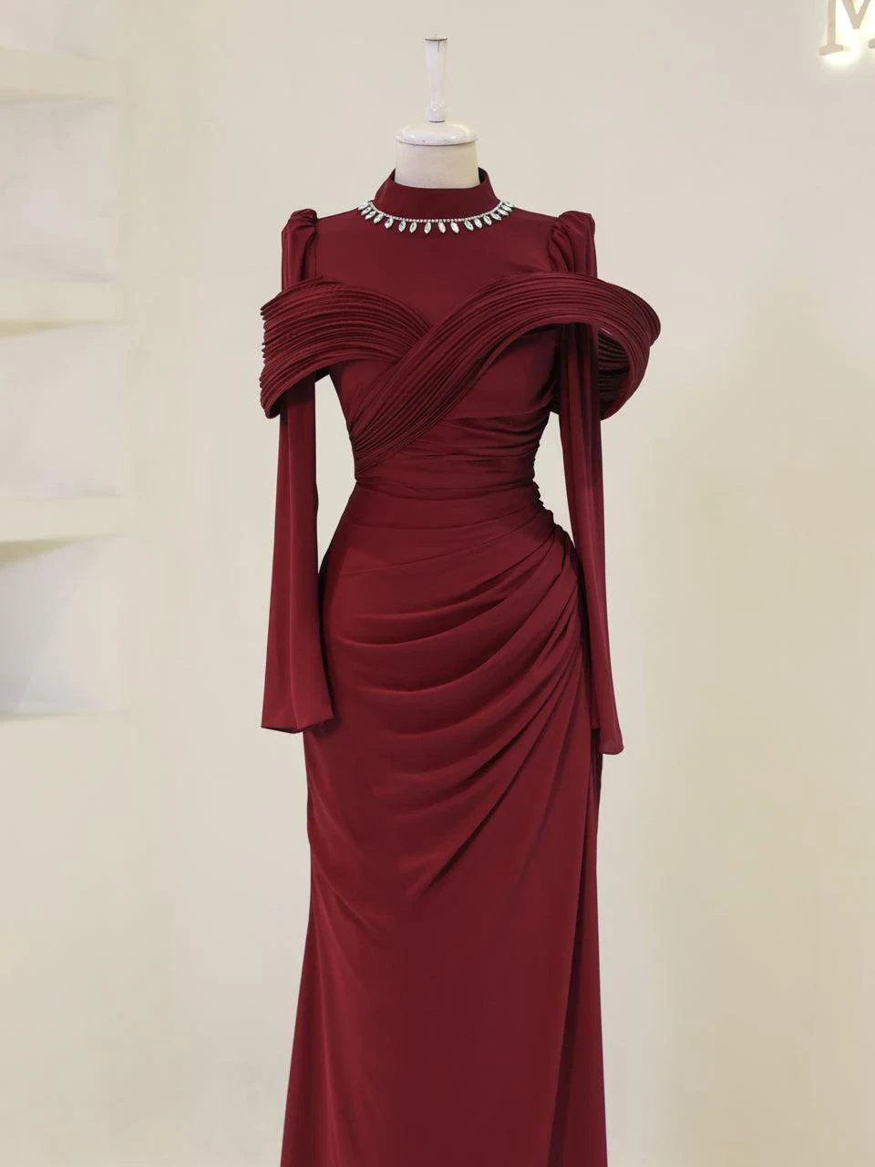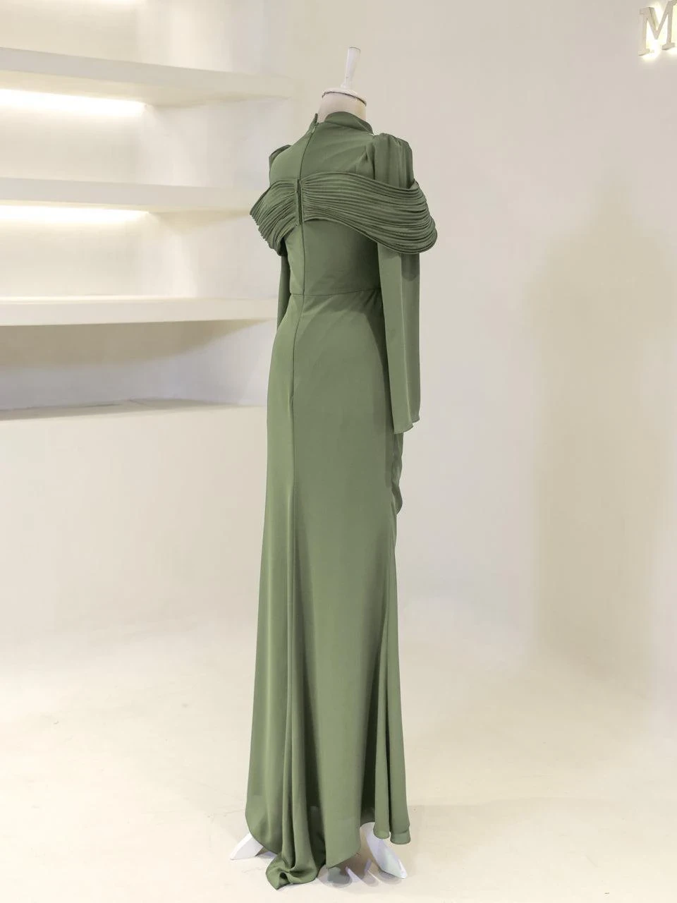 The Grazie Modest Evening Dress is designed with a full-length of 160 cm, crafted from crepe fabric. It features a lining for added comfort and a back zipper for easy wear. The dress includes a built-in bust pad and decorative adhesive embellishments. Its fishtail design adds a touch of sophistication.
