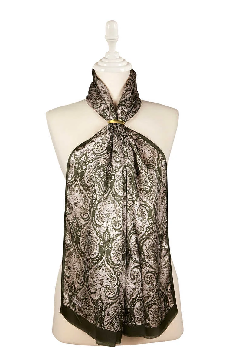 This Green Damask Pattern Silk Scarf is designed to complement your style in various settings, from business meetings to art galleries. Made from 100% silk, it offers a luxurious feel and ease of use. The scarf originates from Bursa, Turkey, known for its quality silk production. With dimensions of 45×165 cm, it provides versatility in styling.