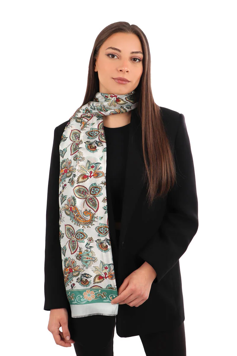 The Green Paisley Pattern Voile Silk Scarf combines elegance and versatility. Crafted in Bursa, Turkey, it features a light and soft texture that ensures comfortable wear without irritating your skin. Measuring 45 x 150 cm, it offers ease of use as an accessory for various outfits.