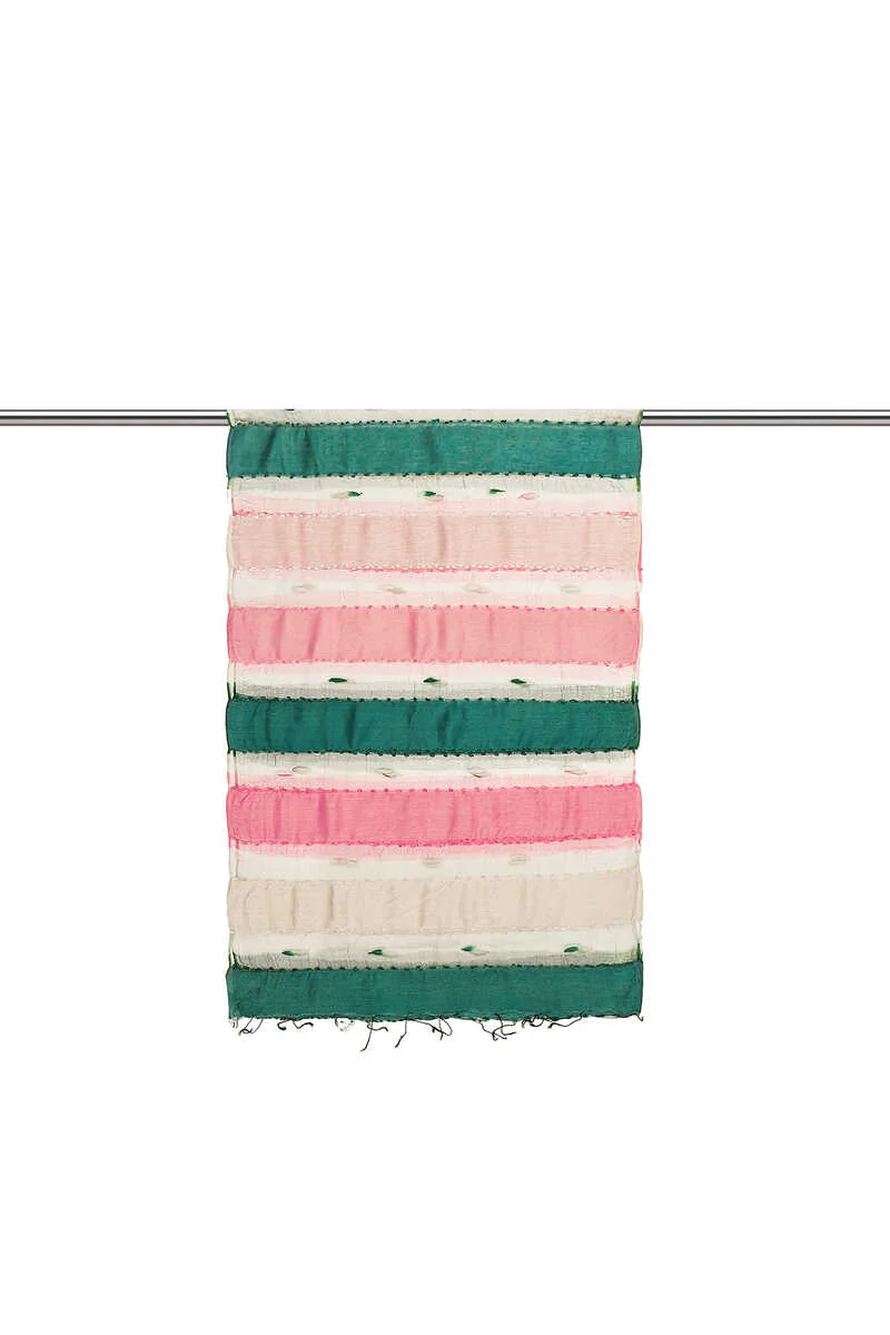 The Yeşil Pembe Degrade Kozalı Fular is a scarf featuring green and pink colors with a classic pattern. Made from silk, viscose, and cotton, it measures 60×180 cm and originates from Bursa, Turkey.
