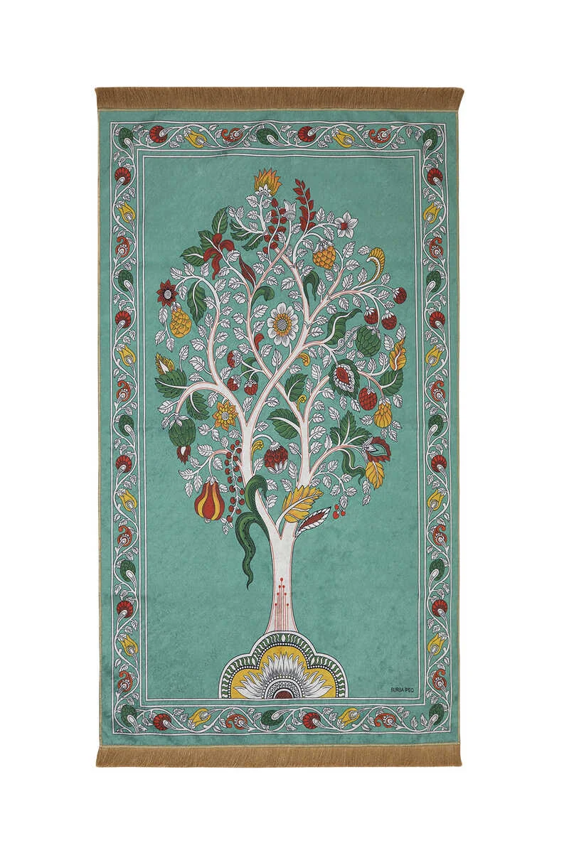 The Yeşil Kadife Halı Seccade features a silky texture and eye-catching colors with Turkish motifs and tile patterns. It is designed for comfortable use with dimensions of 65×115 cm and originates from Bursa, Turkey.