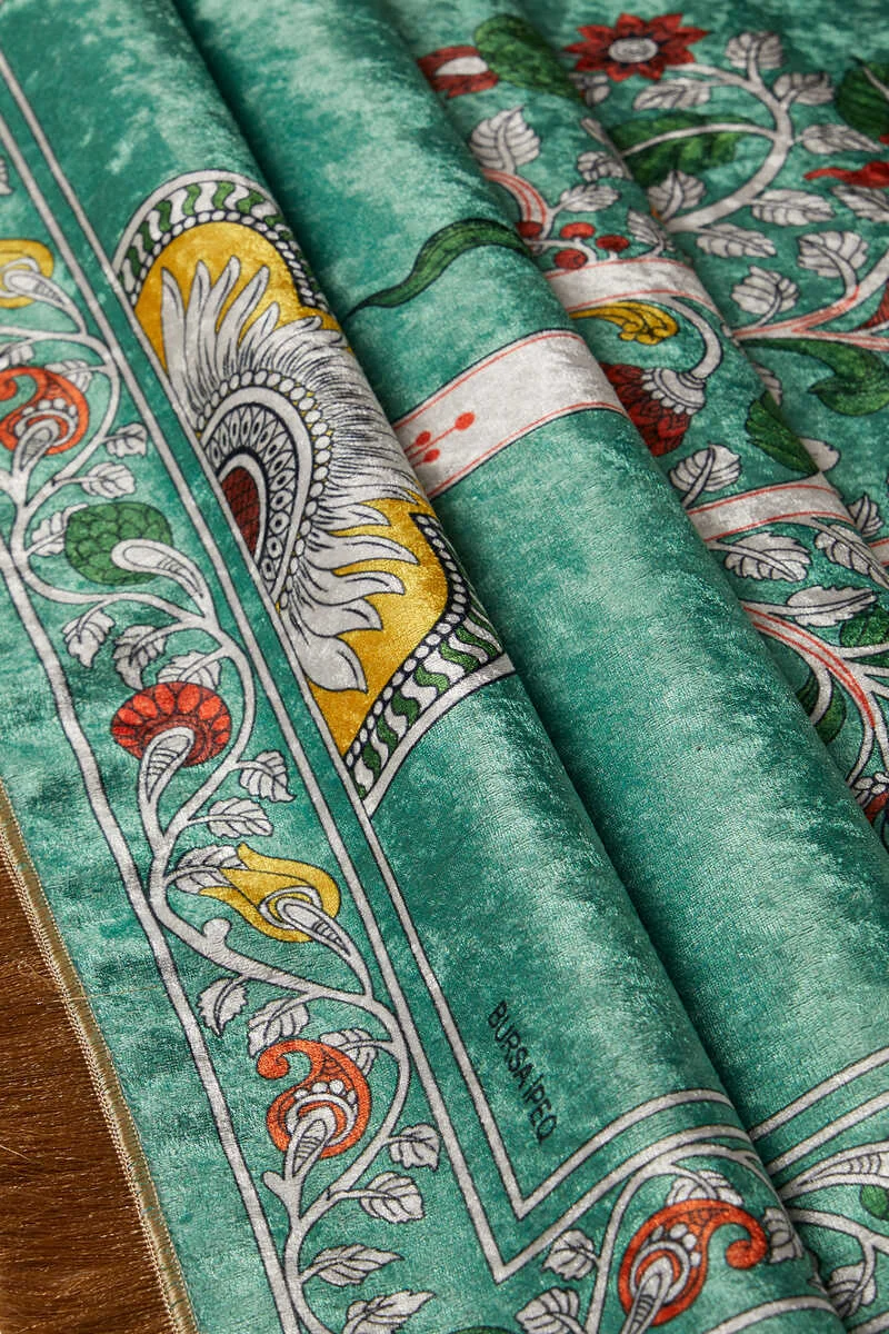 This Green Velvet Prayer Rug combines traditional Turkish motifs with intricate tile patterns, offering a decorative look. Measuring 65×115 cm, it is crafted in Bursa, Turkey. The rug's velvet texture ensures comfortable use during prayers.
