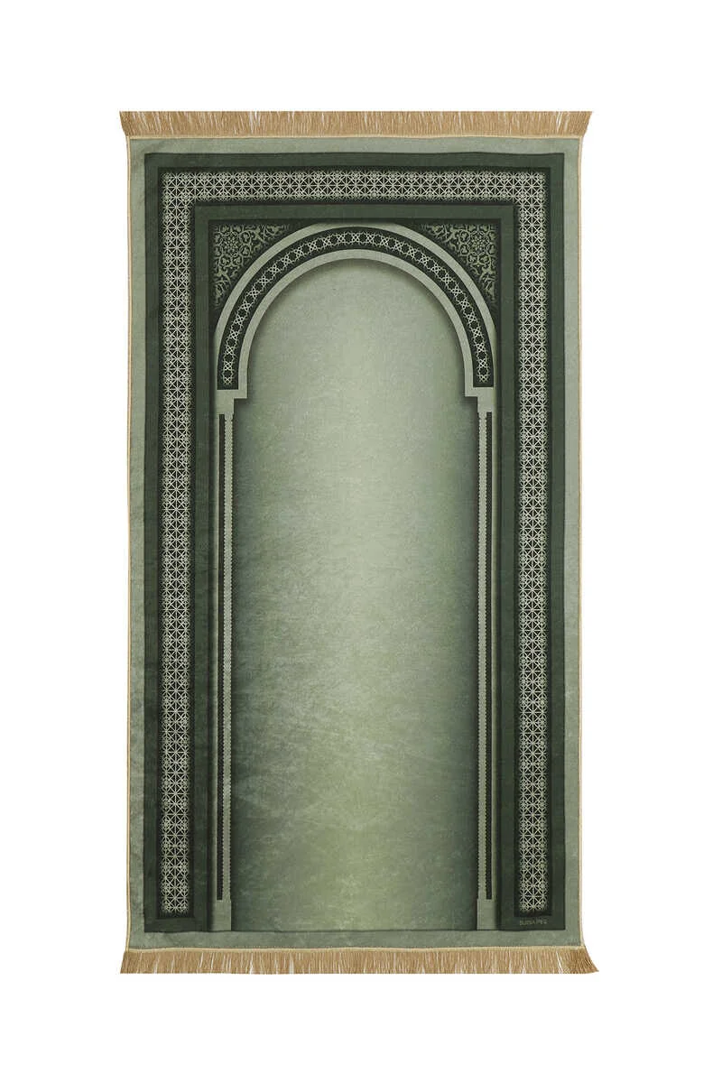 This green velvet prayer rug features traditional Turkish motifs and intricate tile patterns, offering a decorative appearance. Designed in Bursa, Turkey, it measures 65×115 cm, providing ample space for comfortable prayer. The rug's velvet texture adds a touch of elegance to any room while ensuring durability and ease of maintenance.