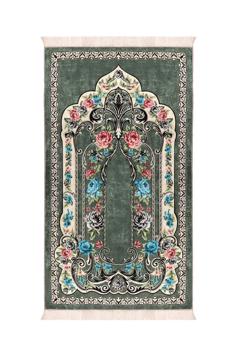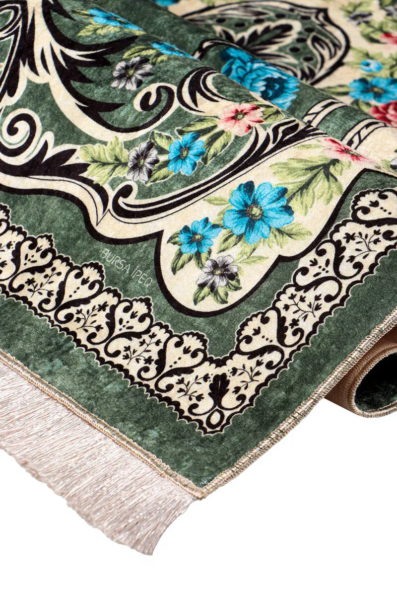 The Yeşil Süngerli Kadife Seccade is a velvet prayer rug designed for comfort and style, featuring a soft velvet surface and sponge filling for support. It measures 65 x 115 cm and is made in Bursa, Turkey.