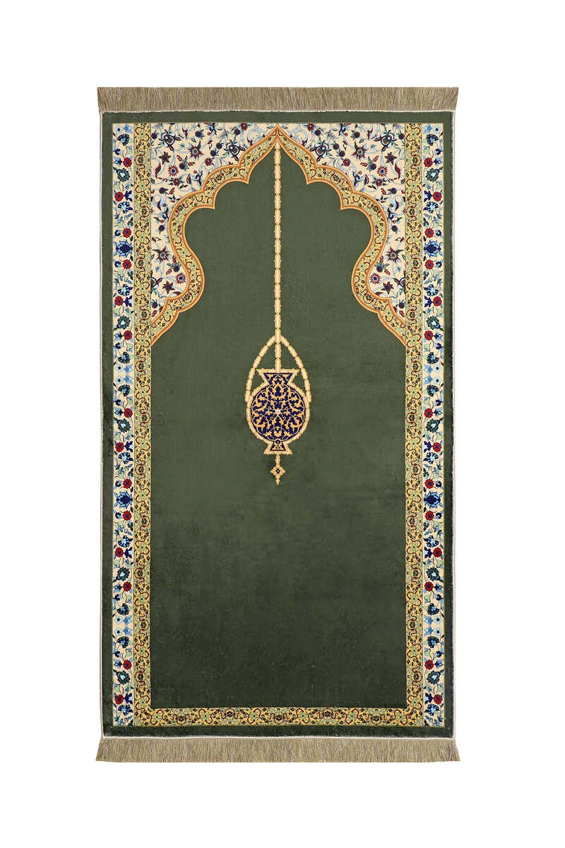 The Haki Bambu Halı Seccade features a silky texture and eye-catching colors with Turkish motifs and ceramic patterns. It is made from bamboo, measures 65x115cm, and is designed for comfortable use.