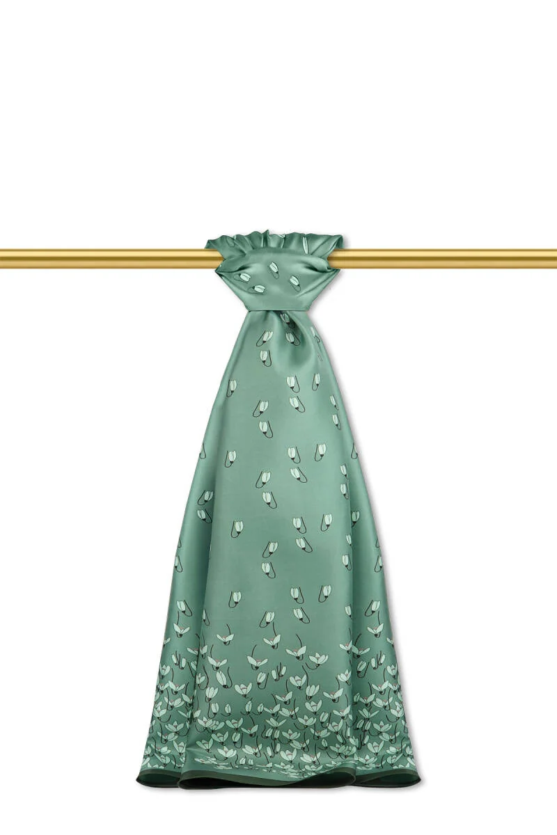 The Haki Kardelen Pattern Twill Silk Scarf is inspired by the elegance and natural beauty of the snowdrop flower. Crafted in Bursa, Turkey, it features a composition of 100% twill silk. With dimensions of 65 x 200 cm, this scarf offers versatility and ease of use for various styling options.