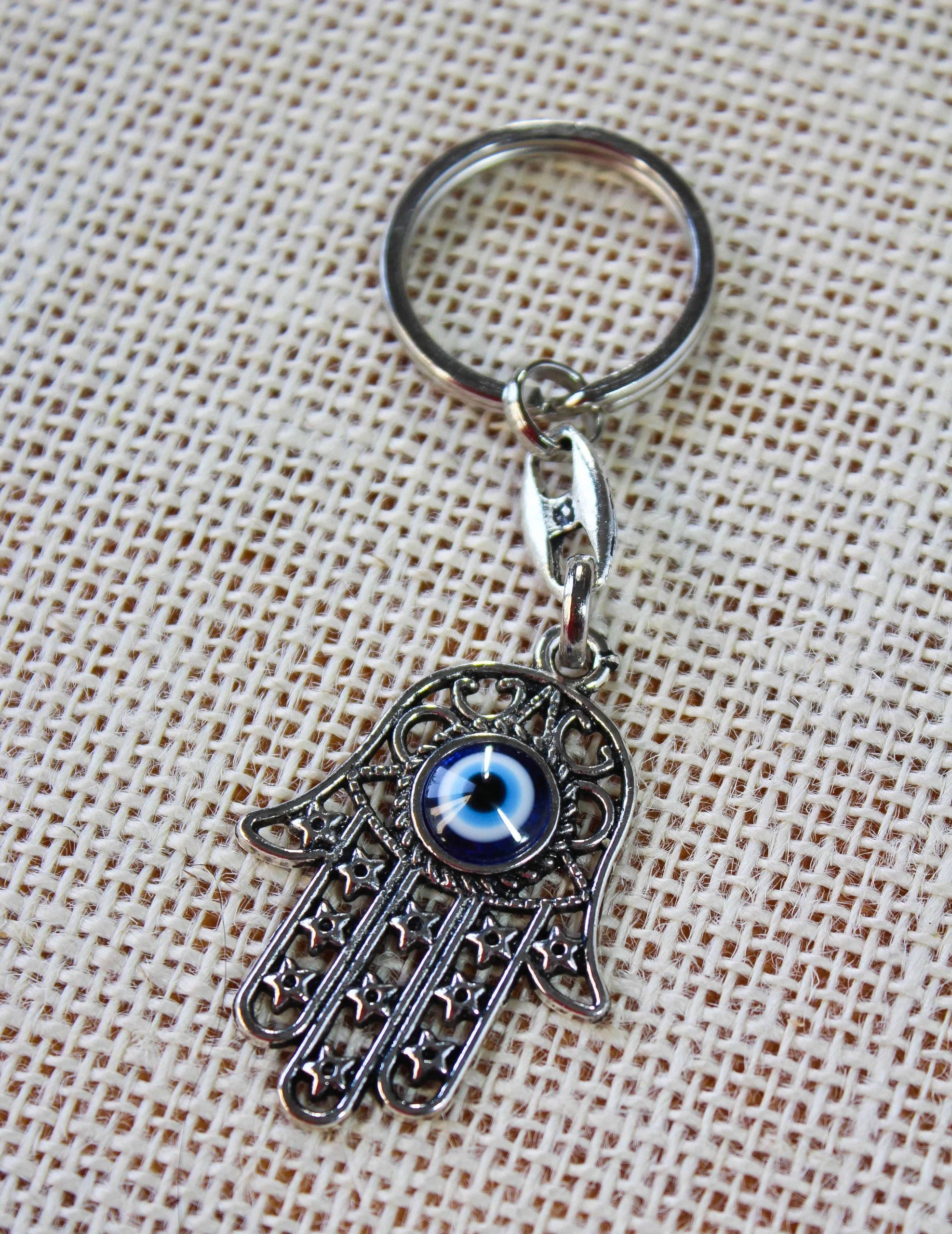 Protect yourself or a loved one with this Evil Eye Hamsa Keychain. The Hamsa brings its owner happiness, luck, health, and good fortune. Simple, quick and easy gift, for those who needing that little extra protection