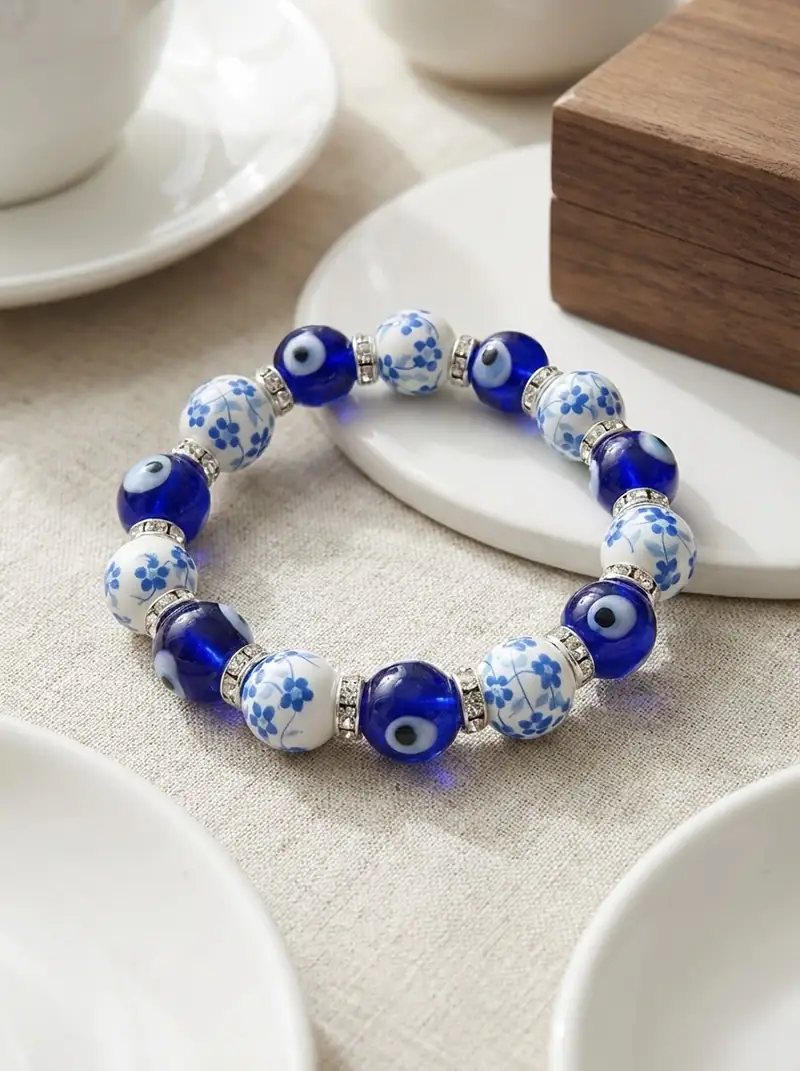 Embrace a timeless symbol of protection and good fortune with our stunning Blue Evil Eye and Floral Porcelain Bead Bracelet. This beautifully crafted piece seamlessly blends ancient tradition with modern elegance, creating a versatile accessory that is as meaningful as it is stylish. Designed to ward off negative energy and invite positive vibes, this Handmade Blue Evil Eye bracelet is more than just jewelry; it’s a personal amulet for your daily life.