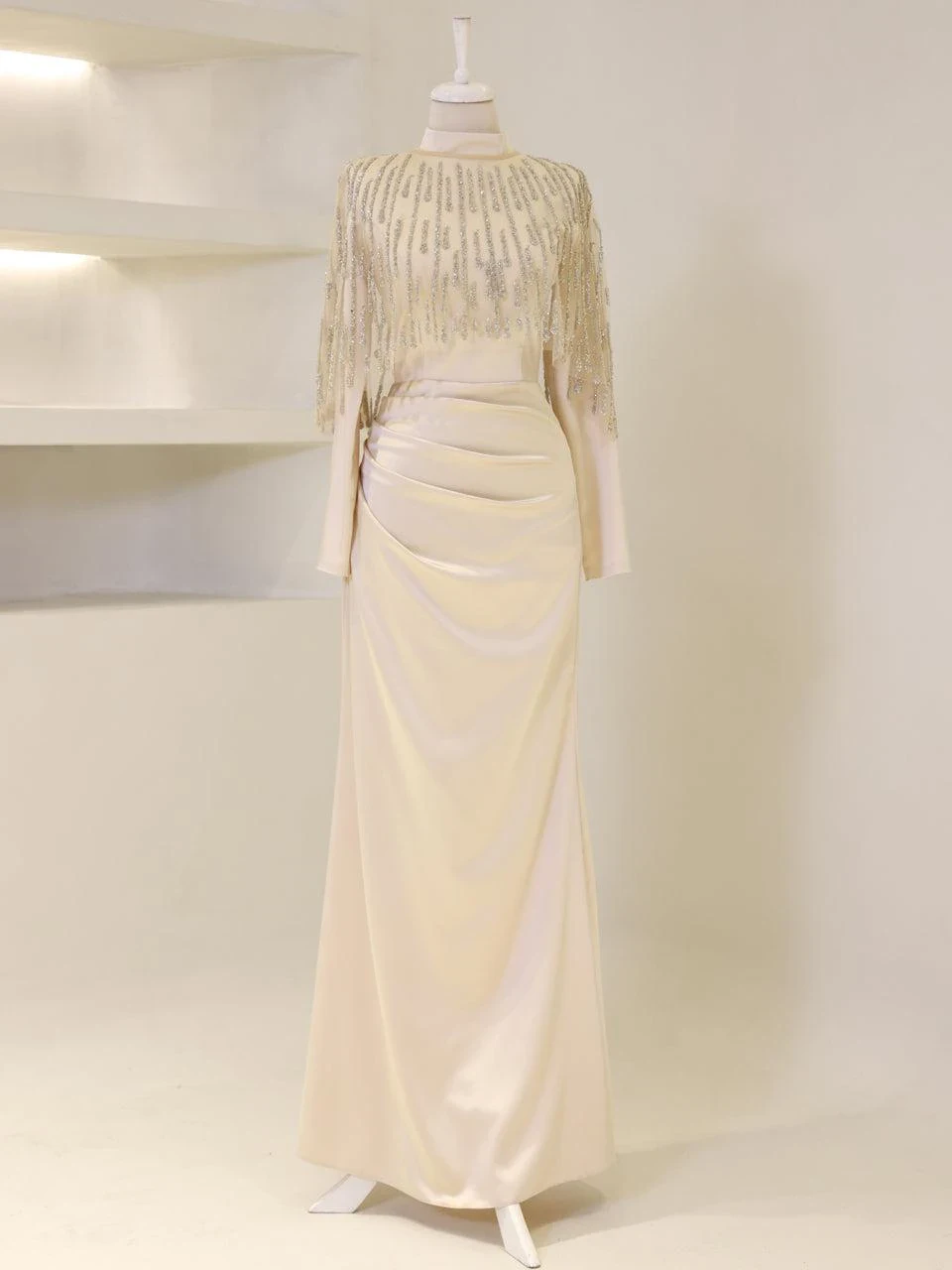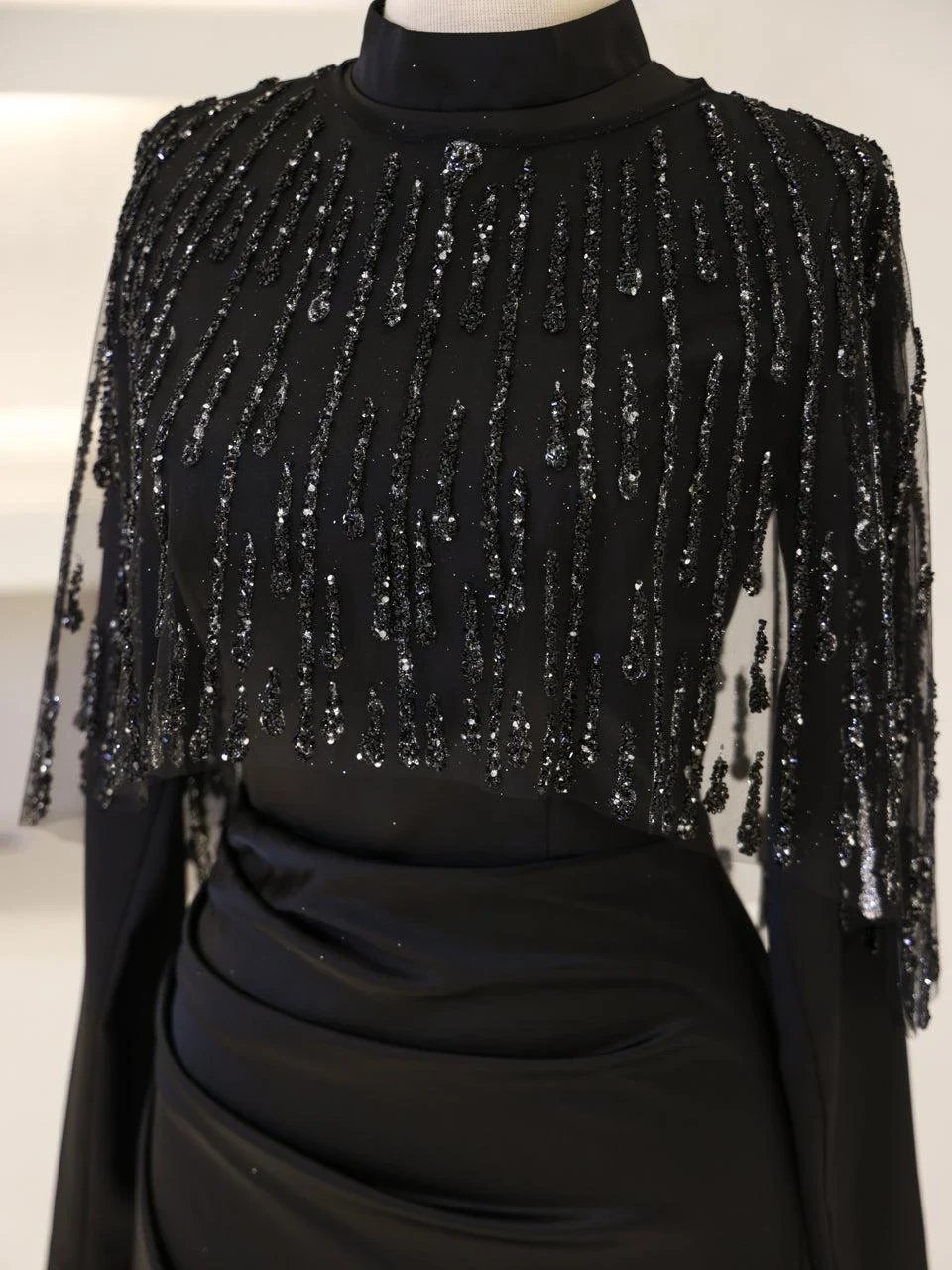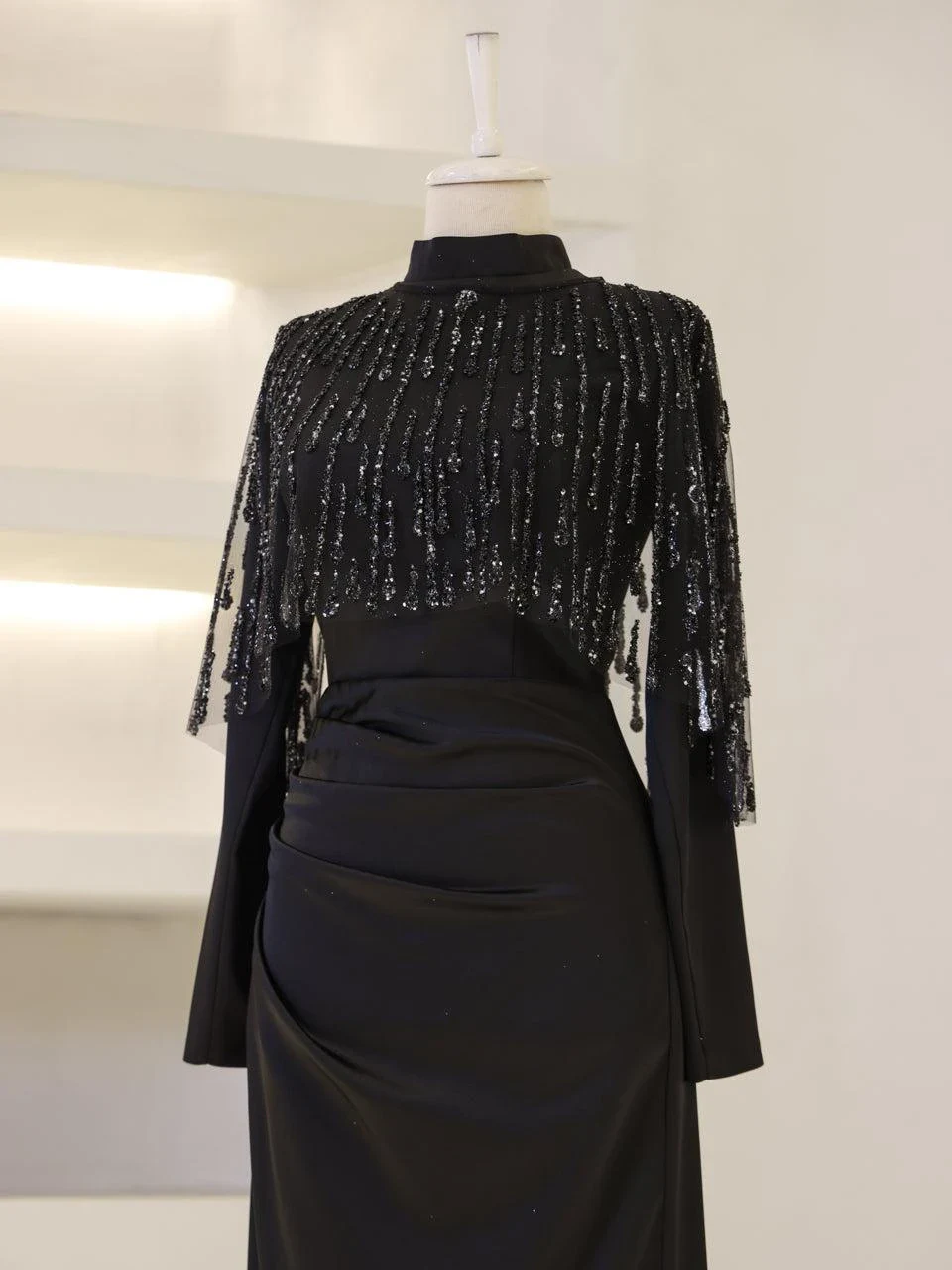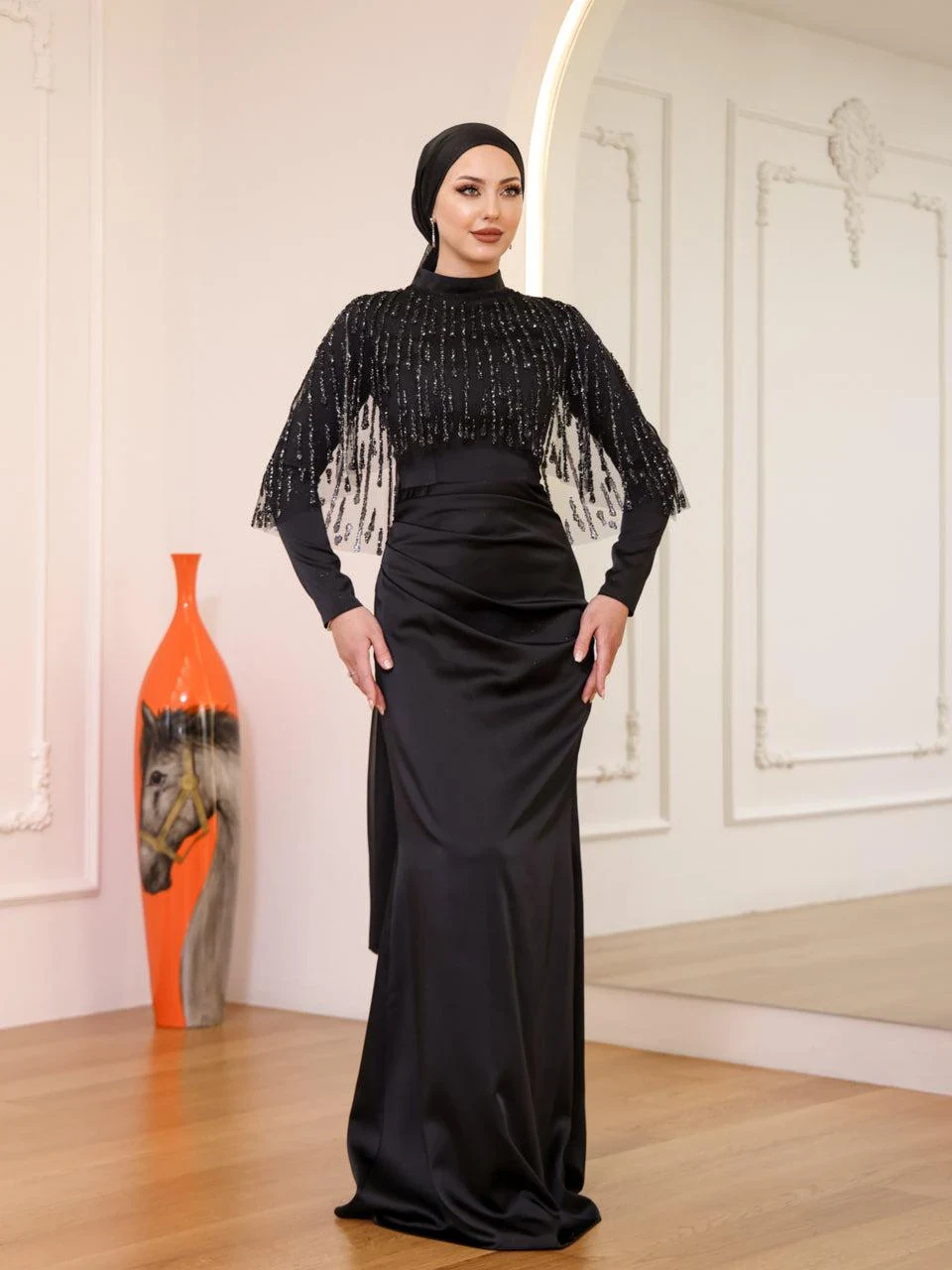 The Helena Modest Evening Dress is crafted from satin fabric and measures 160 cm in length. It is designed with a full lining and features a back zipper for easy wear. The dress has a flared skirt with drape details on the upper skirt section. The detachable cape adds a unique touch, and the embellishments are adhered, which may result in some shedding. However, this will not affect the overall appearance of the dress.