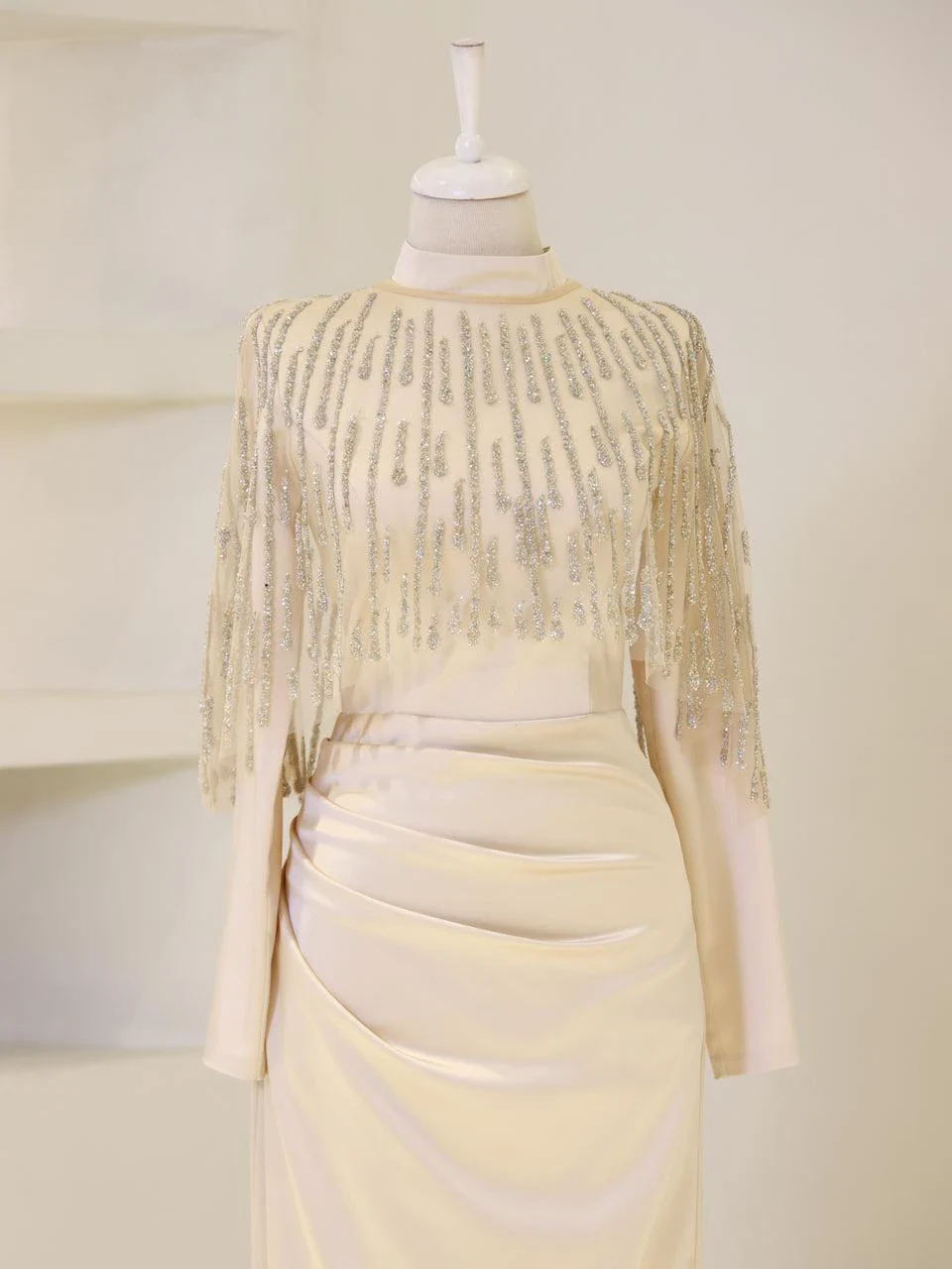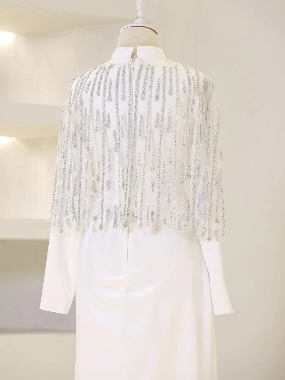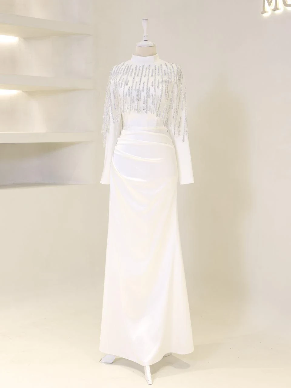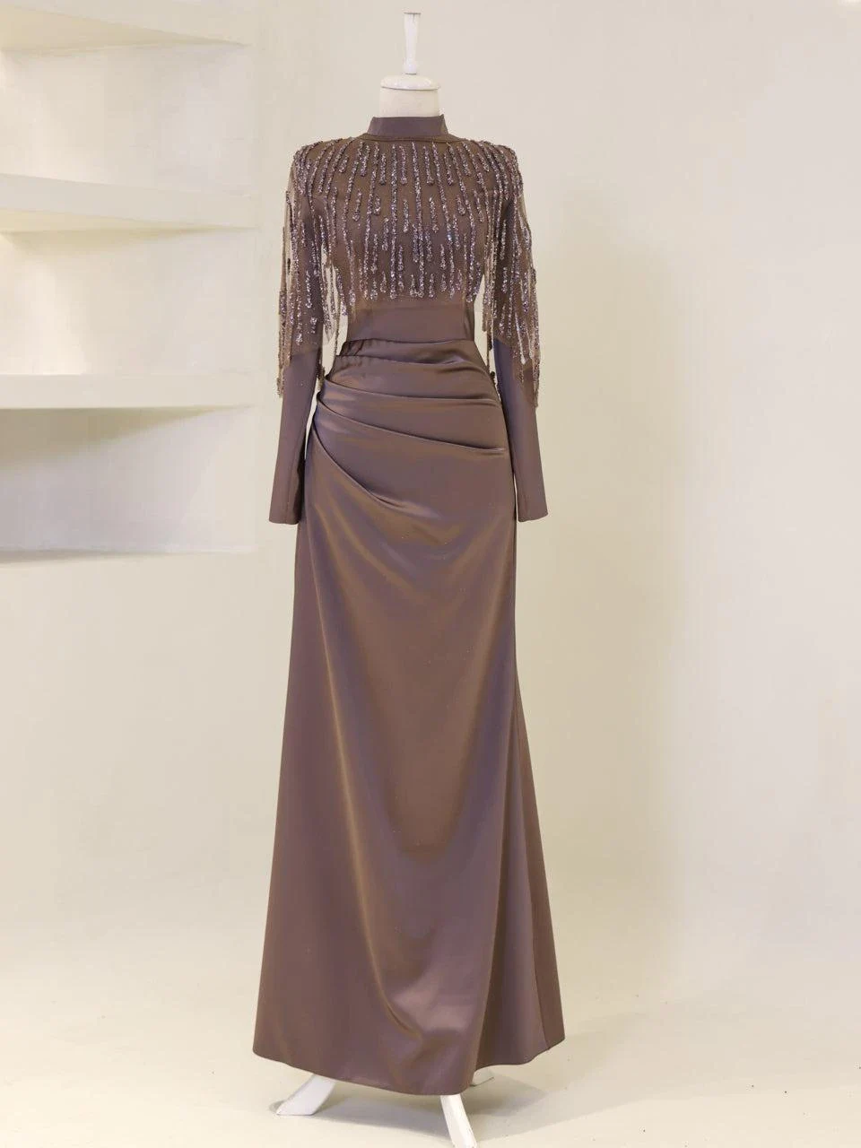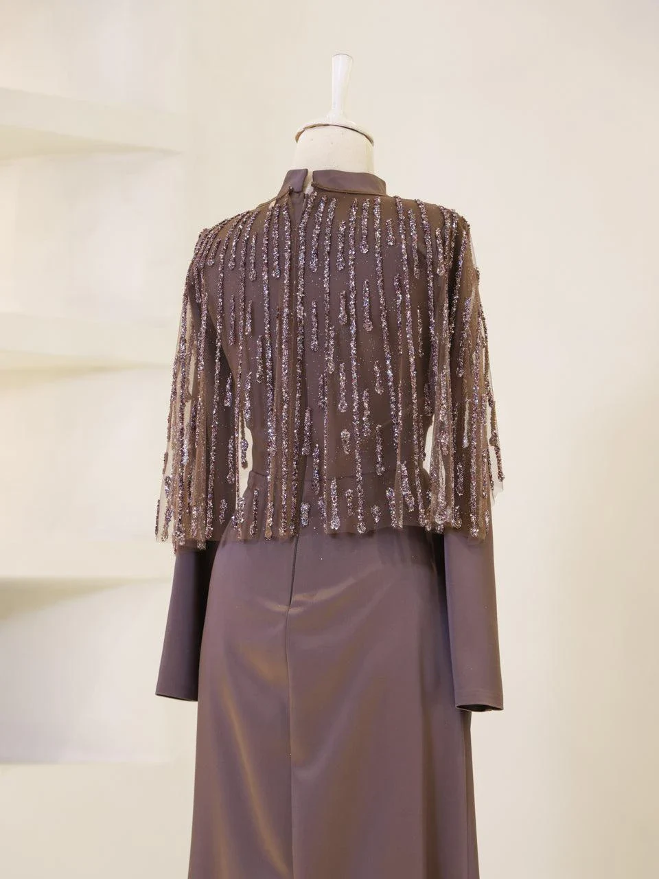 The Helena Modest Evening Dress is crafted from satin fabric and measures 160 cm in length. It is designed with a full lining and features a back zipper for easy wear. The dress has a flared skirt with drape details on the upper skirt section. The detachable cape adds a unique touch, and the embellishments are adhered, which may result in some shedding. However, this will not affect the overall appearance of the dress.