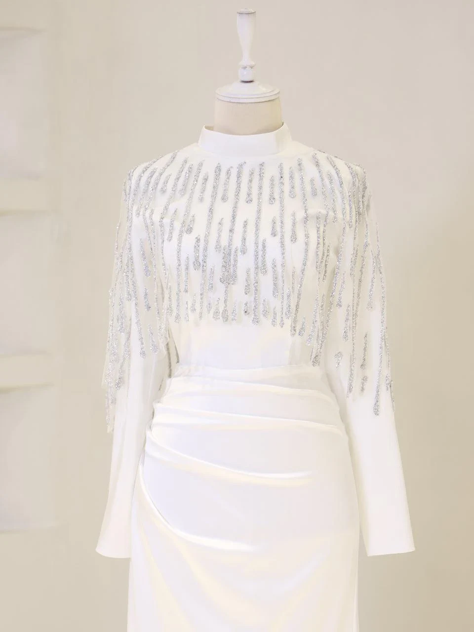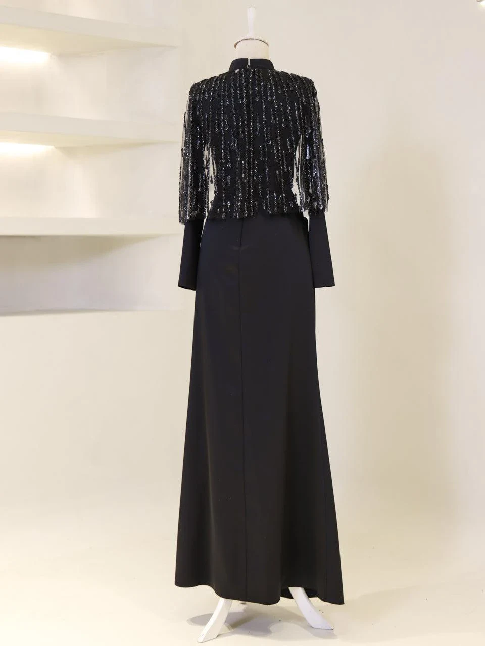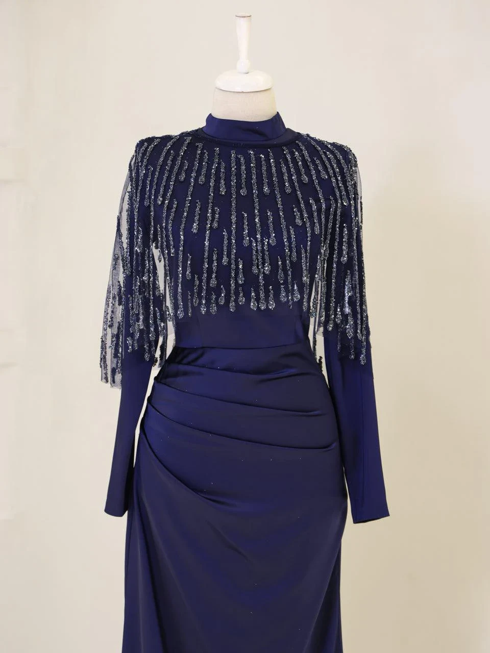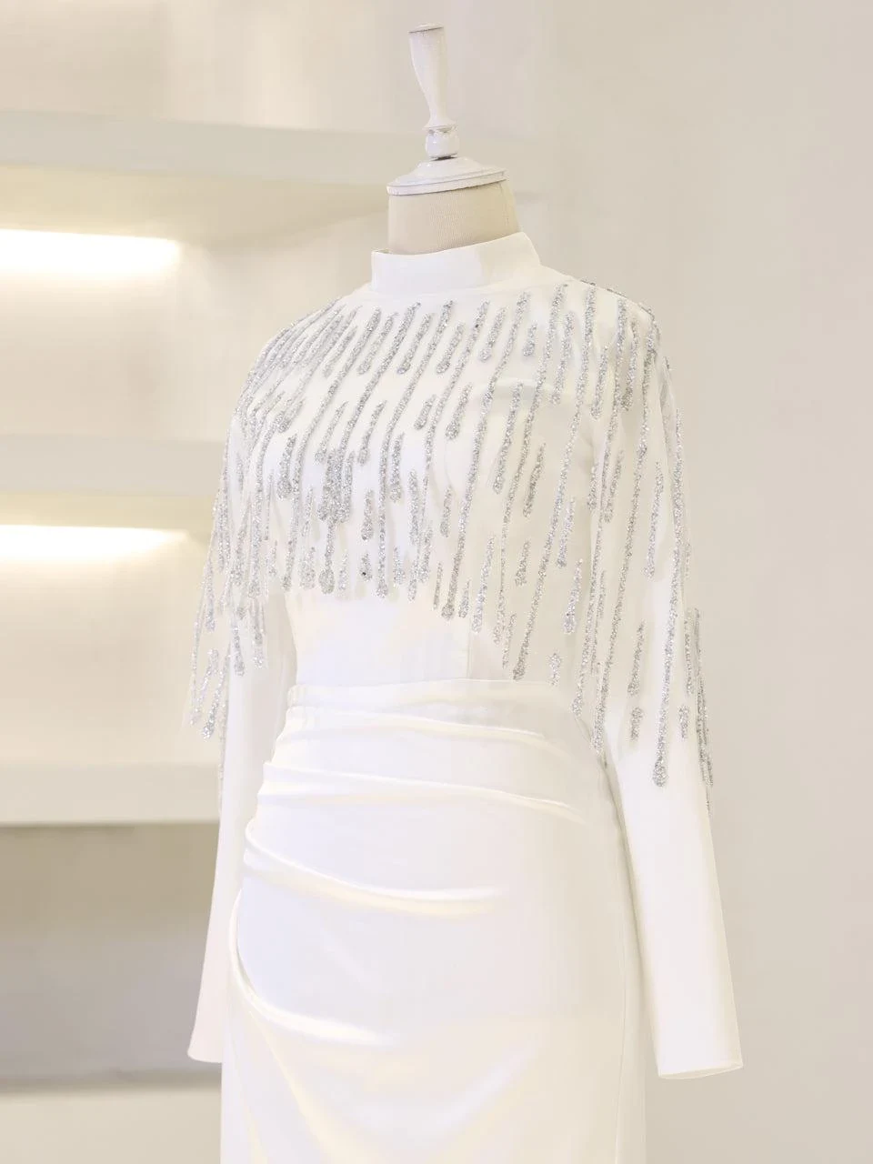 The Helena Modest Evening Dress is crafted from satin fabric and measures 160 cm in length. It is designed with a full lining and features a back zipper for easy wear. The dress has a flared skirt with drape details on the upper skirt section. The detachable cape adds a unique touch, and the embellishments are adhered, which may result in some shedding. However, this will not affect the overall appearance of the dress.