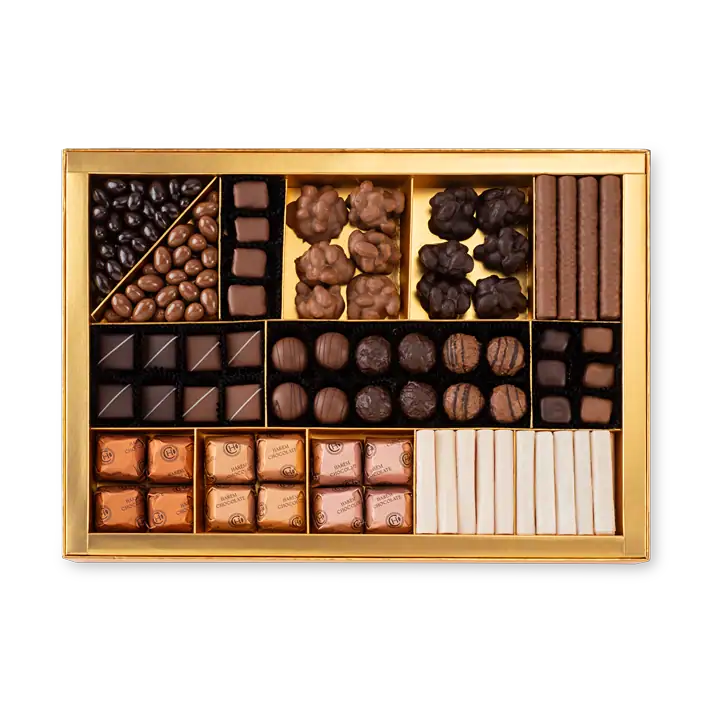 The Hello Box by Harem Chocolate offers a unique blend of artistry and exquisite flavors. This assortment includes some of Harem Chocolate’s most cherished delights, perfect for any occasion. Say ‘Hello’ to a world of flavors you won’t be able to resist. The box contains a variety of chocolates such as Milk and Dark Chocolate Coated Pistachio Dragees, Milk and Dark Chocolate Pistachio Rochers, Milk Chocolate Crepes, Milk and Dark Chocolate Coated Salted Caramel, Milk, Dark, and Hazelnut Truffles, Milk and Dark Chocolate Coated Pistachio Turkish Delight, Cara Pistachio, Cara Almond, Cara Cherry, Pomegranate Roll Turkish Delight, and Mastic Roll Turkish Delight.