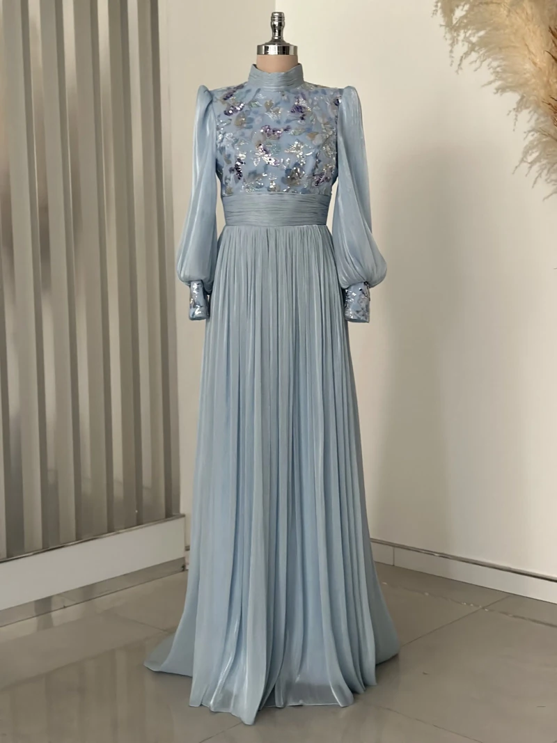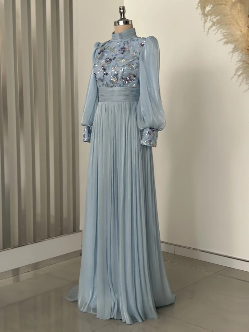 Designed with a graceful high neckline and long puffed sleeves, the dress offers modest coverage while celebrating movement and femininity. The bodice features intricate floral embroidery with shimmering sequins and beadwork — each detail thoughtfully placed to reflect light and bring the gown to life.