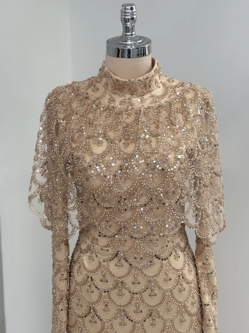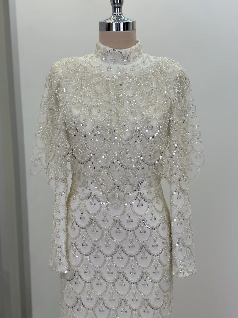 Style Details: High neckline, long sleeves, scalloped sequin pattern, optional cape layer (white version), full coverage