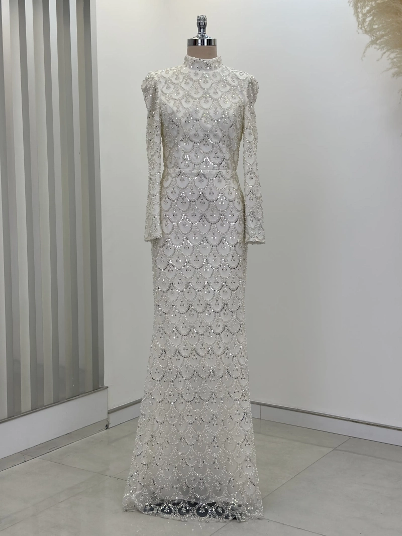 Designed with a classic high neckline and long sleeves, the gown offers full coverage while following a gracefully contoured silhouette. The entire dress is adorned with intricate scalloped embroidery, meticulously hand-embellished with sparkling sequins and delicate beadwork that shimmer beautifully with every step.