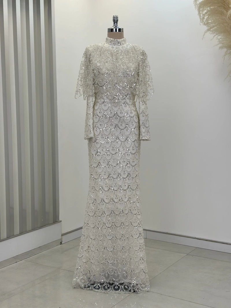 This dazzling gown is a sophisticated blend of modest elegance and vintage glamour, making it a perfect choice for weddings, receptions, and refined evening occasions.