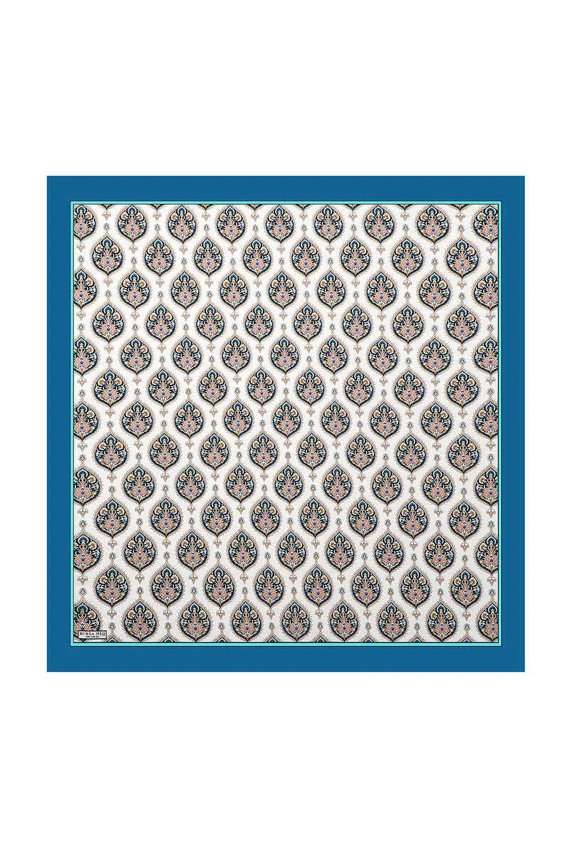The İndigo Hatai Desen İpek Eşarp is a silk scarf measuring 90×90 cm, made from 100% silk. It originates from Bursa, Turkey and is categorized under silk scarves.