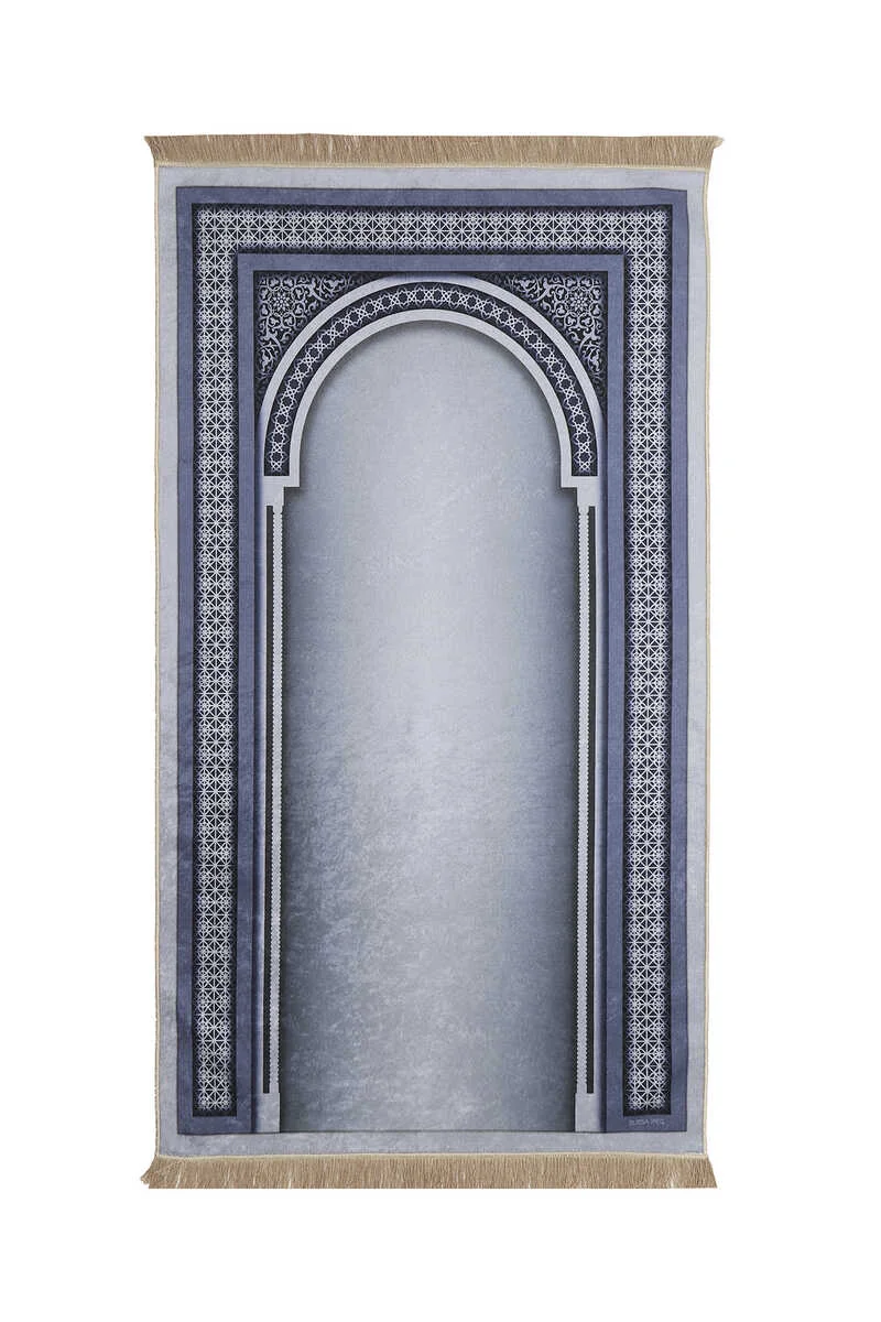 The İndigo Kadife Halı Seccade is a Turkish motif and Çini patterned prayer rug with an velvety texture, designed for decorative appeal. It measures 65×115 cm and is made in Bursa, Turkey.