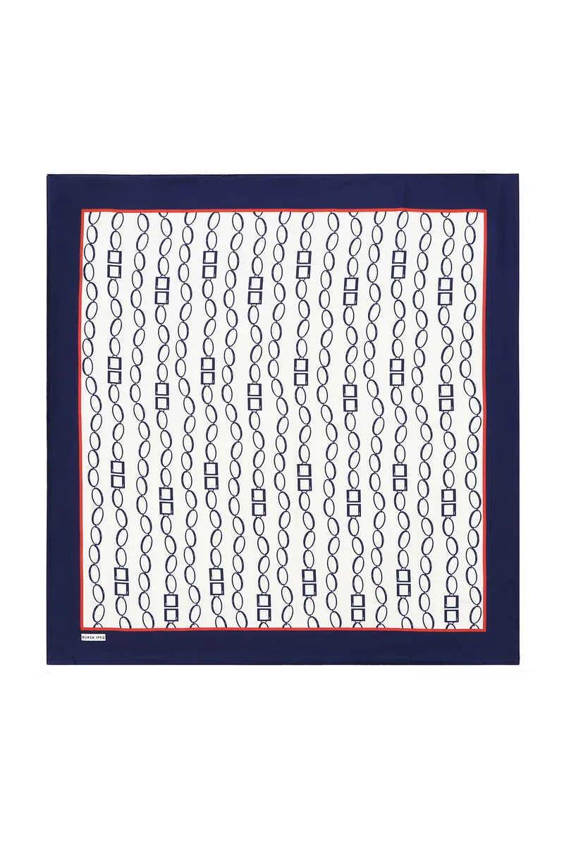 The Ivory Navy Chain Pattern Twill Silk Scarf combines unique elegance and comfort. Crafted from 100% silk, this scarf offers a luxurious feel and a sophisticated look. With dimensions of 90x90cm, it provides ease of use for various styling options. Originating from Bursa, Turkey, it reflects quality craftsmanship.
