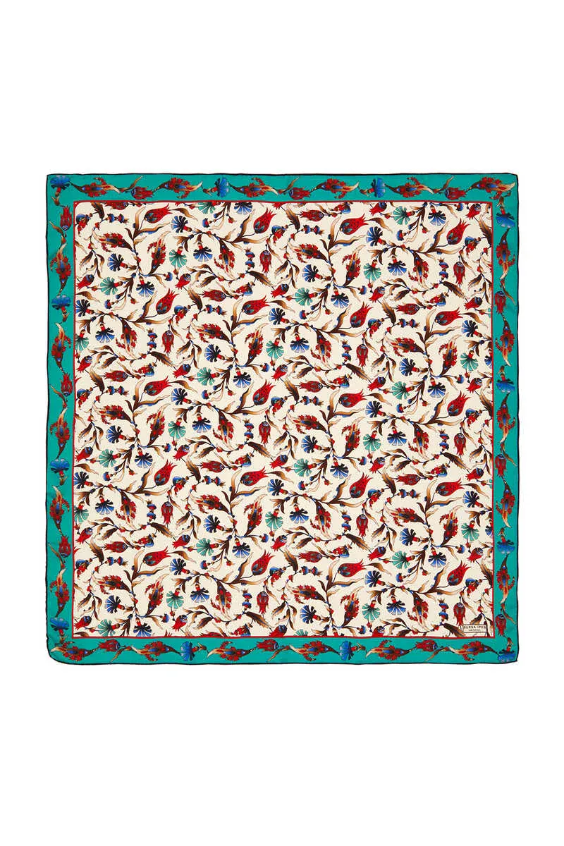 The Ekru Petrol Karanfil Lale Desen İpek Eşarp is a silk scarf featuring a carnation and tulip pattern in vibrant colors. Made from 100% silk, it measures 90×90 cm and originates from Bursa, Turkey.