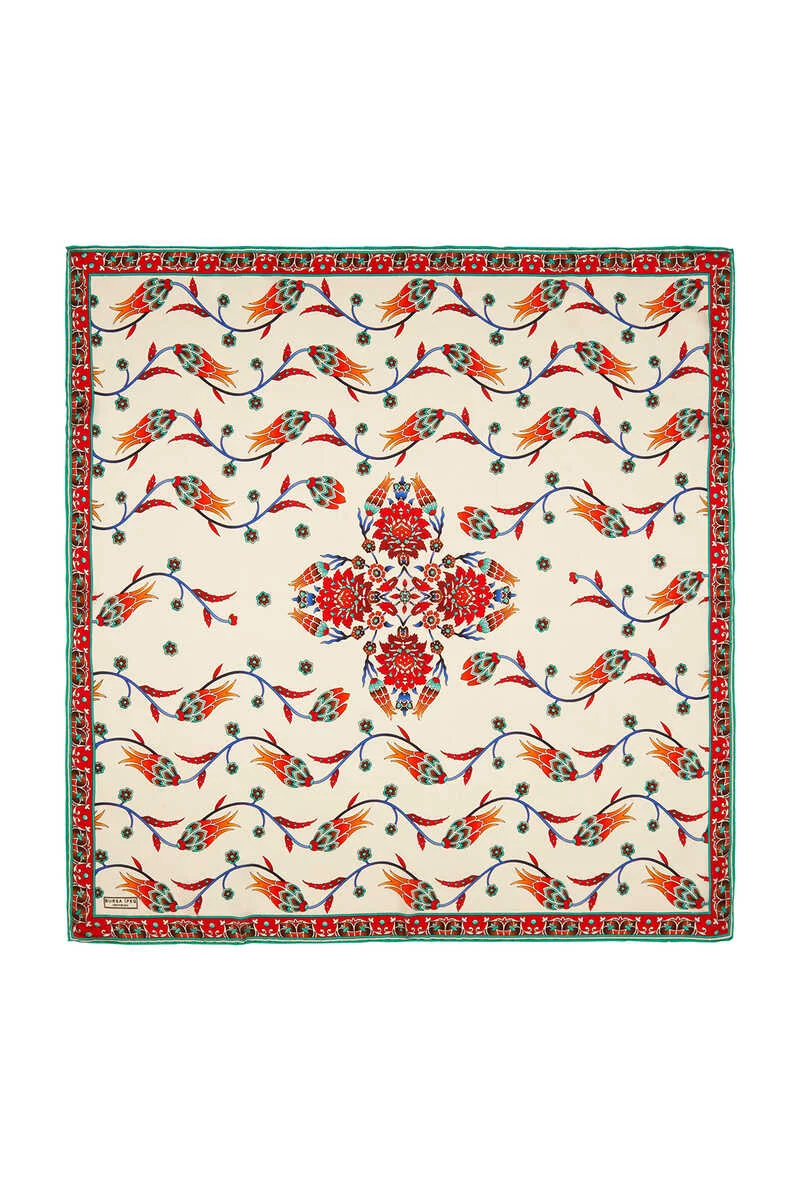 This silk scarf combines an ivory petrol color with a tulip pattern, offering a vibrant yet classic choice. Crafted from 100% silk, it provides a luxurious feel and appearance. The dimensions of 90×90 cm offer versatility in styling. Originating from Bursa, Turkey, this scarf is perfect for adding a touch of elegance to any outfit.