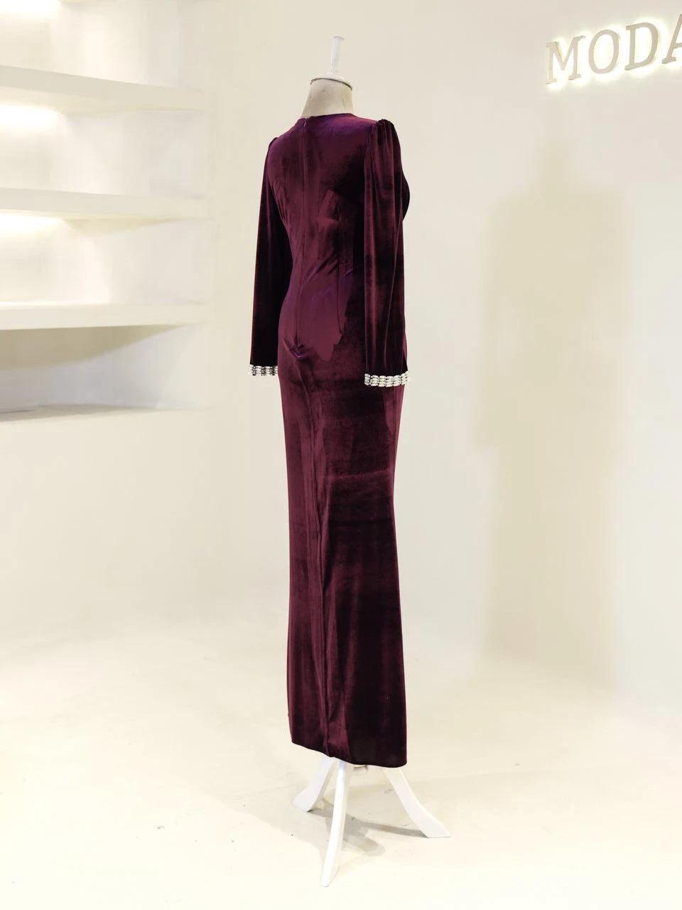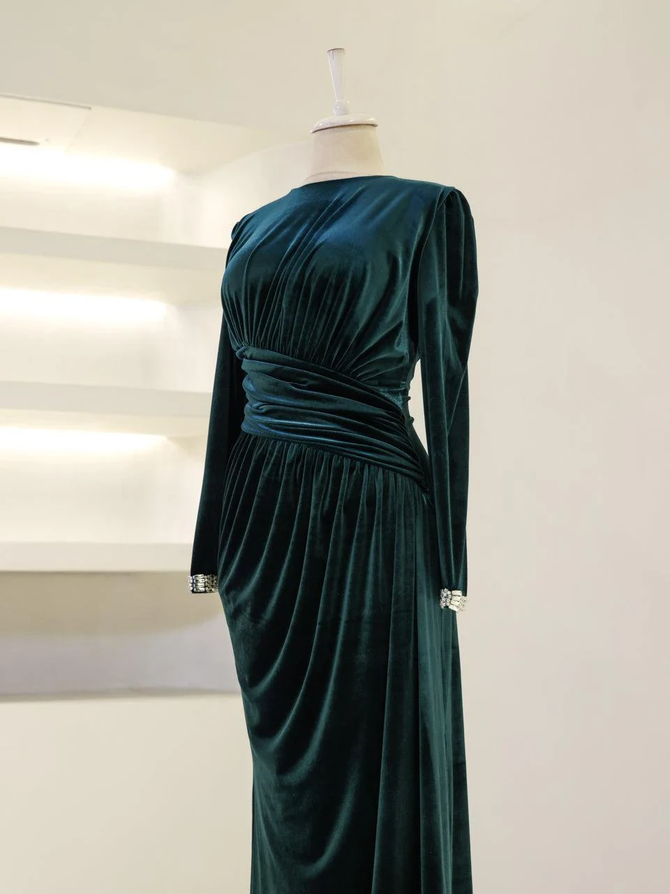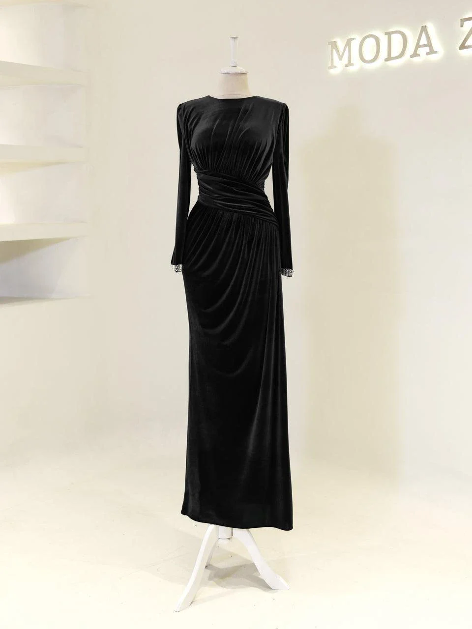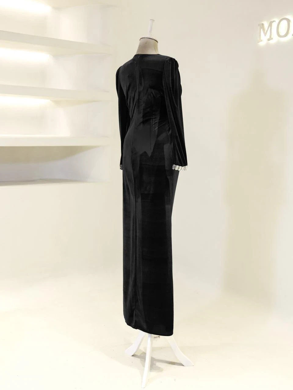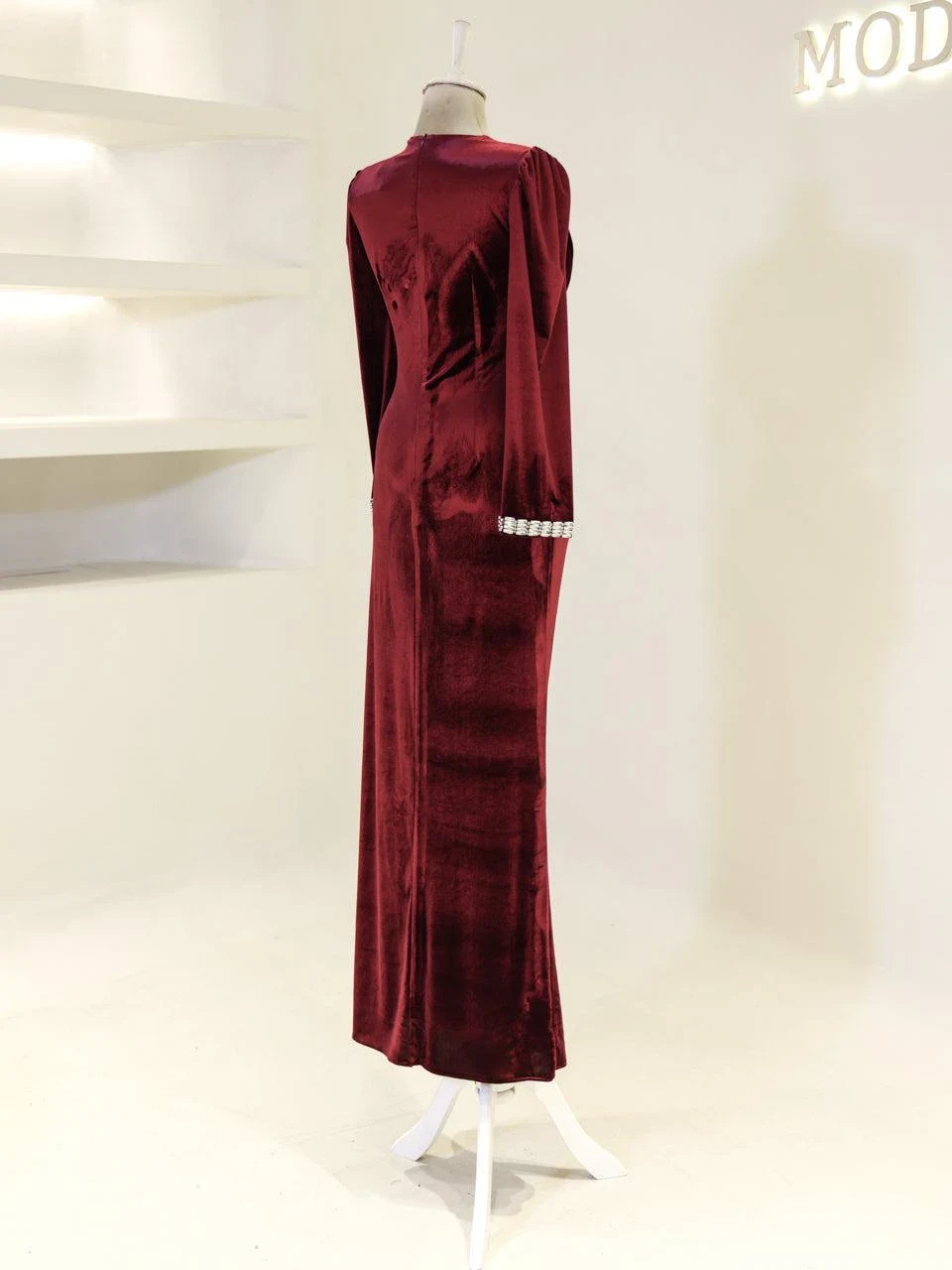 The Joana Modest Evening Dress is designed with a true-to-size fit and measures 155 cm in length. Made from luxurious velvet fabric, this dress includes a lining for added comfort. It features a built-in bust pad and a back zipper closure. The cuffs are adorned with stone details, which are securely attached. The dress has a straight skirt design, offering a classic and elegant look.