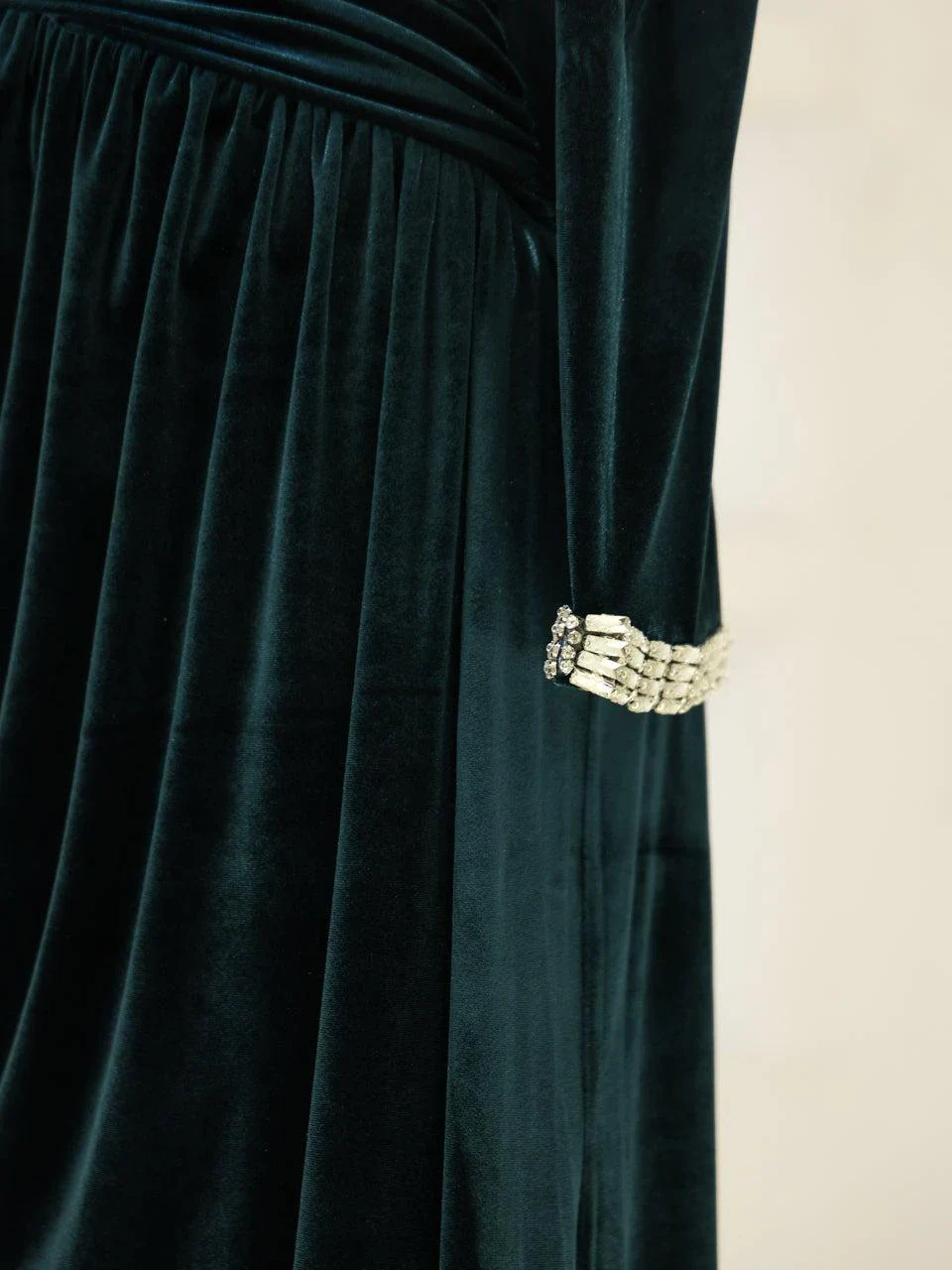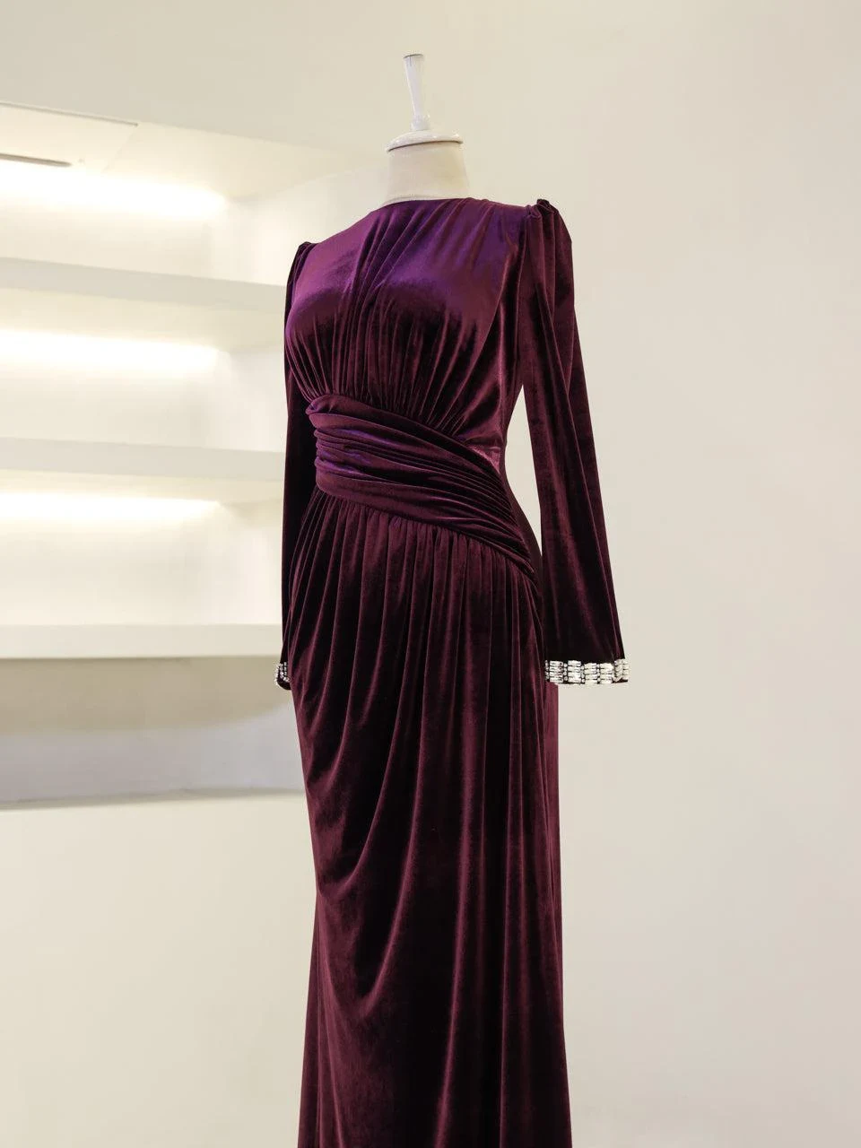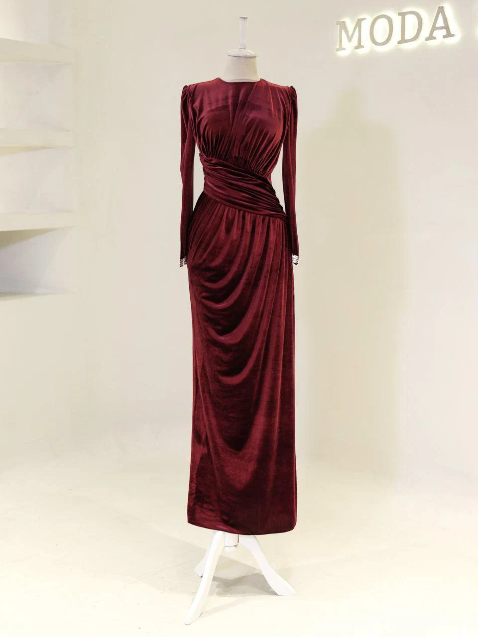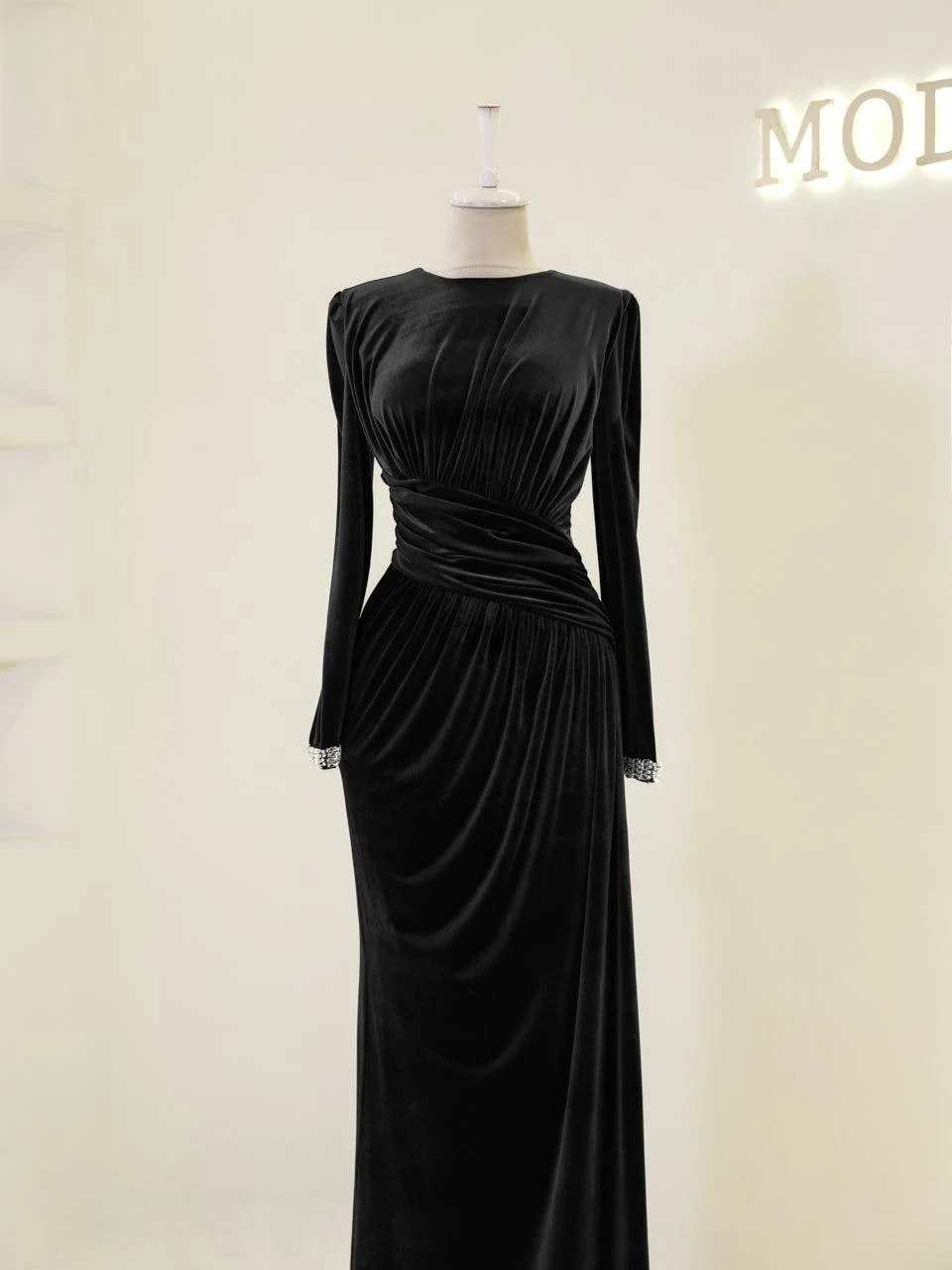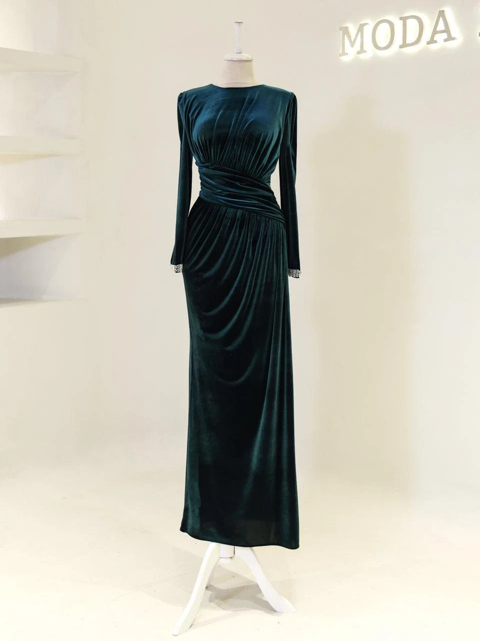 The Joana Modest Evening Dress is designed with a true-to-size fit and measures 155 cm in length. Made from luxurious velvet fabric, this dress includes a lining for added comfort. It features a built-in bust pad and a back zipper closure. The cuffs are adorned with stone details, which are securely attached. The dress has a straight skirt design, offering a classic and elegant look.