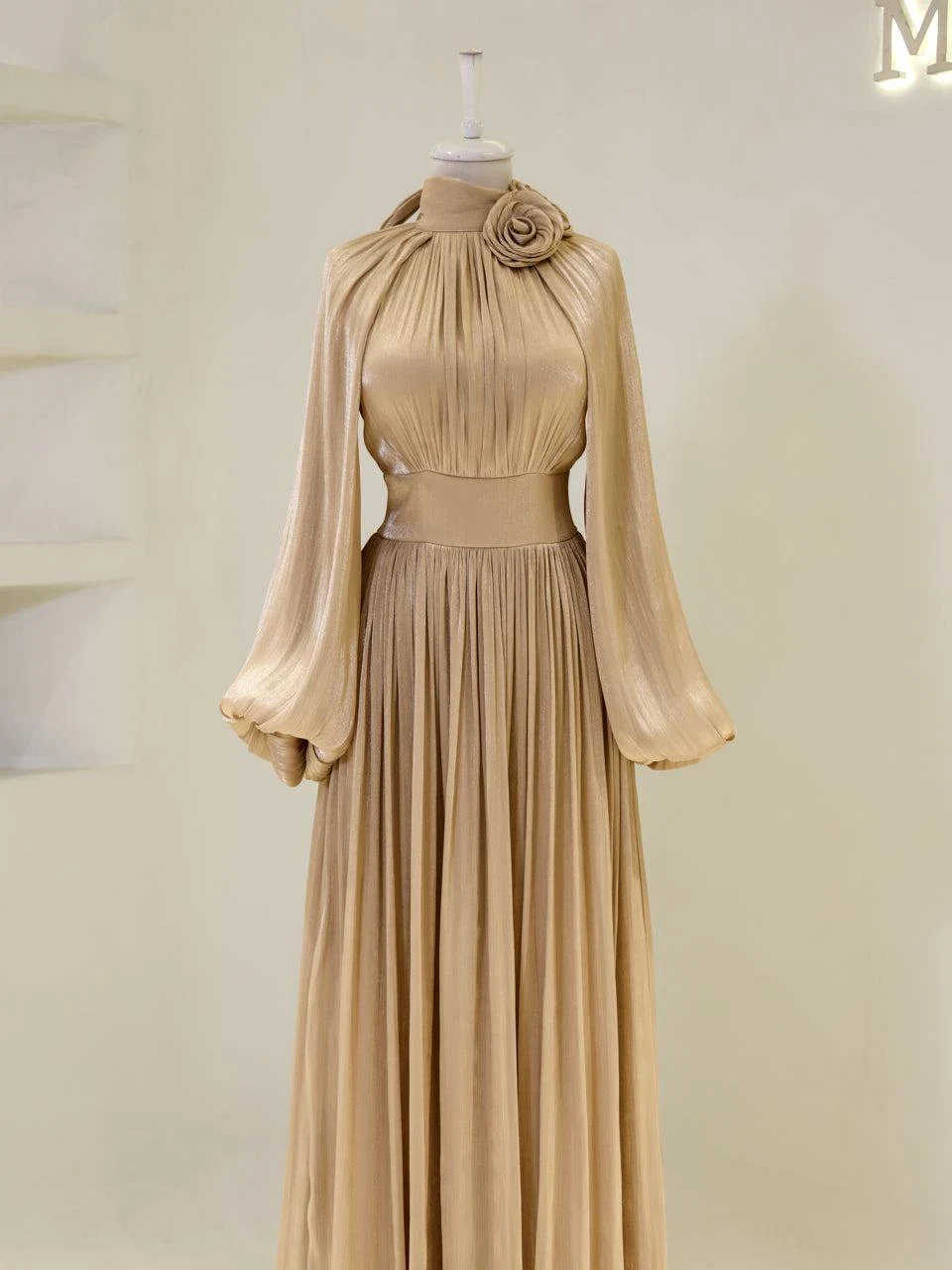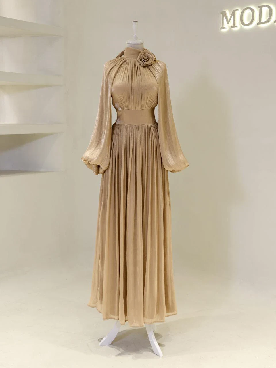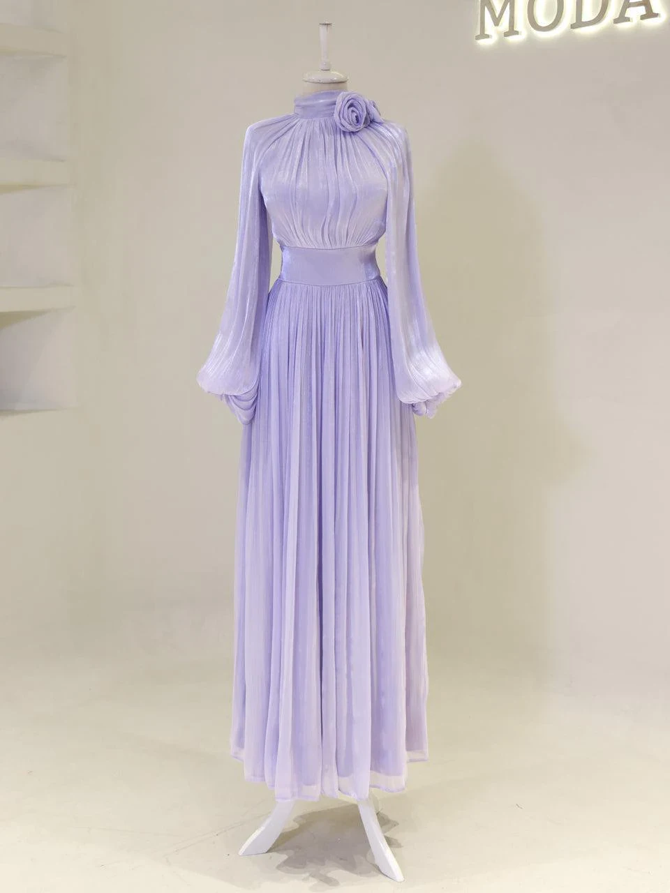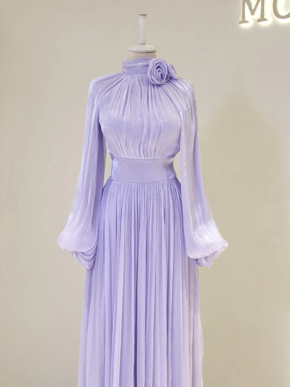 The Kavin Modest Evening Dress is designed with a full fit, ensuring comfort and elegance. It features a length of 150 cm and is made from orchid fabric, providing a luxurious feel. The dress is fully lined and includes a back zipper for easy wear. The balloon sleeves add a unique touch, while the detachable brooch detail on the shoulder offers versatility. The pleated skirt design enhances the overall sophisticated look.