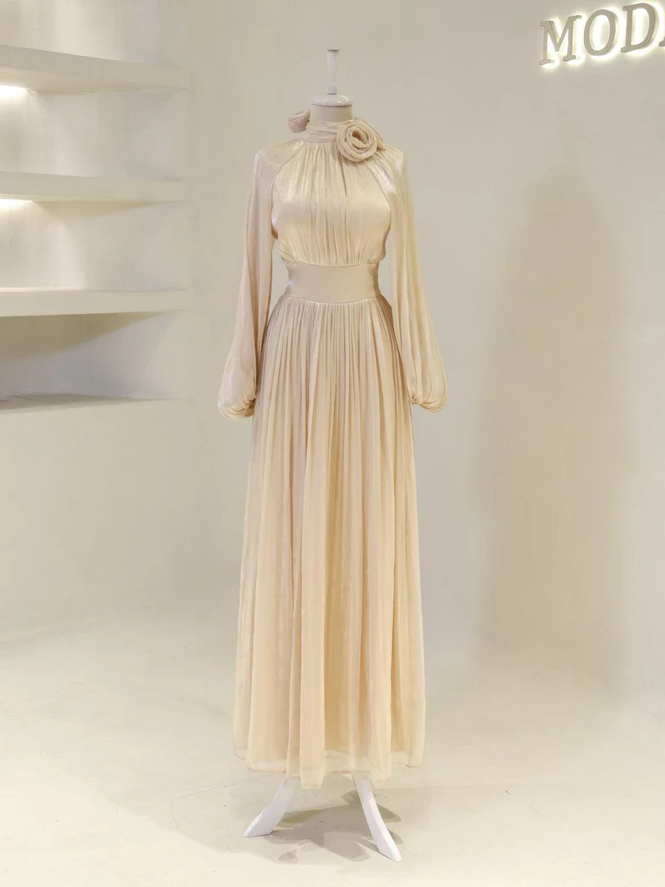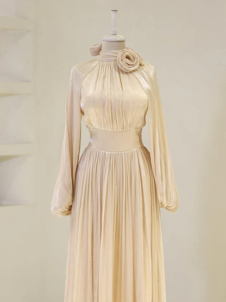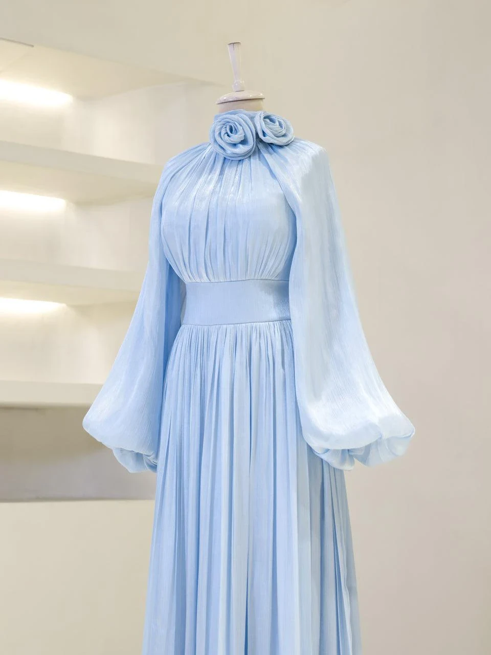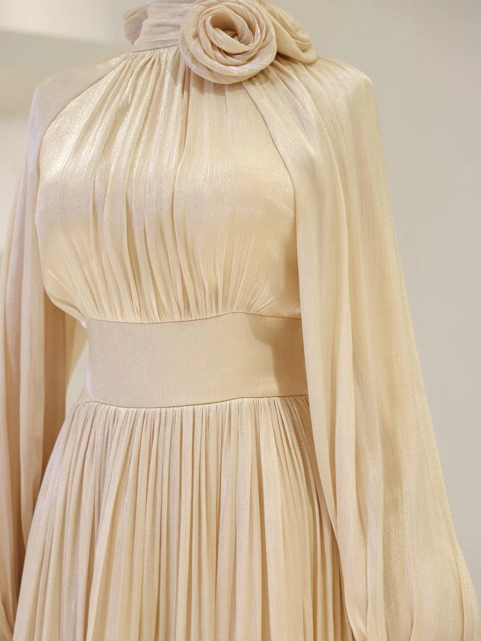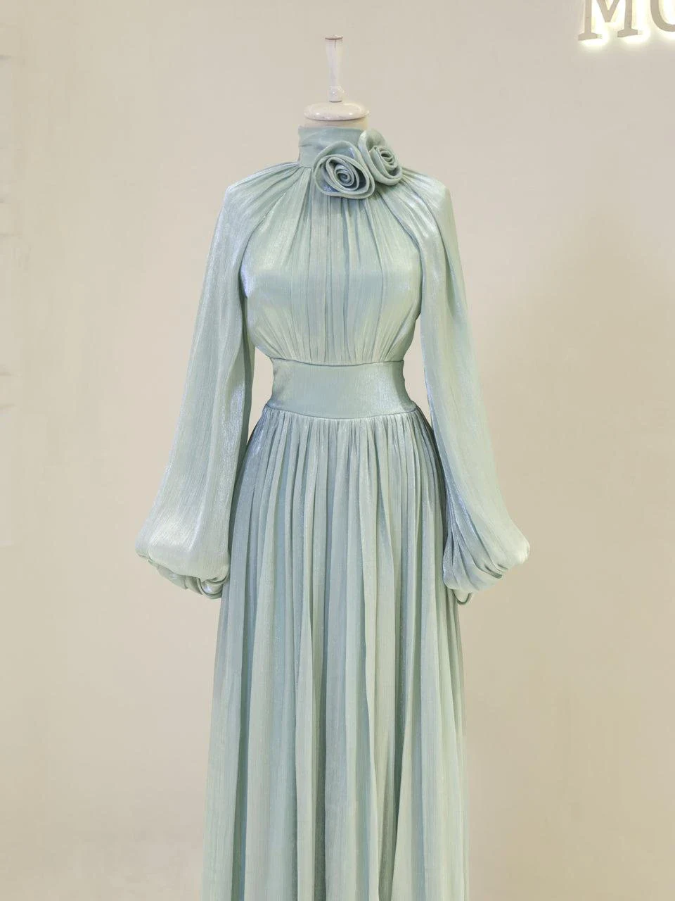 The Kavin Modest Evening Dress is designed with a full fit, ensuring comfort and elegance. It features a length of 150 cm and is made from orchid fabric, providing a luxurious feel. The dress is fully lined and includes a back zipper for easy wear. The balloon sleeves add a unique touch, while the detachable brooch detail on the shoulder offers versatility. The pleated skirt design enhances the overall sophisticated look.