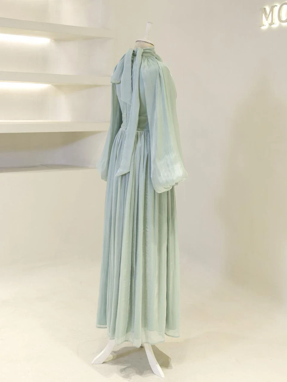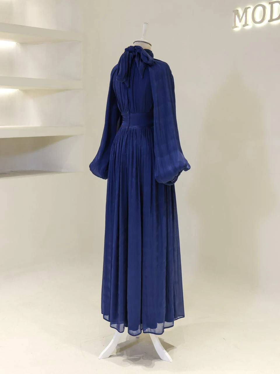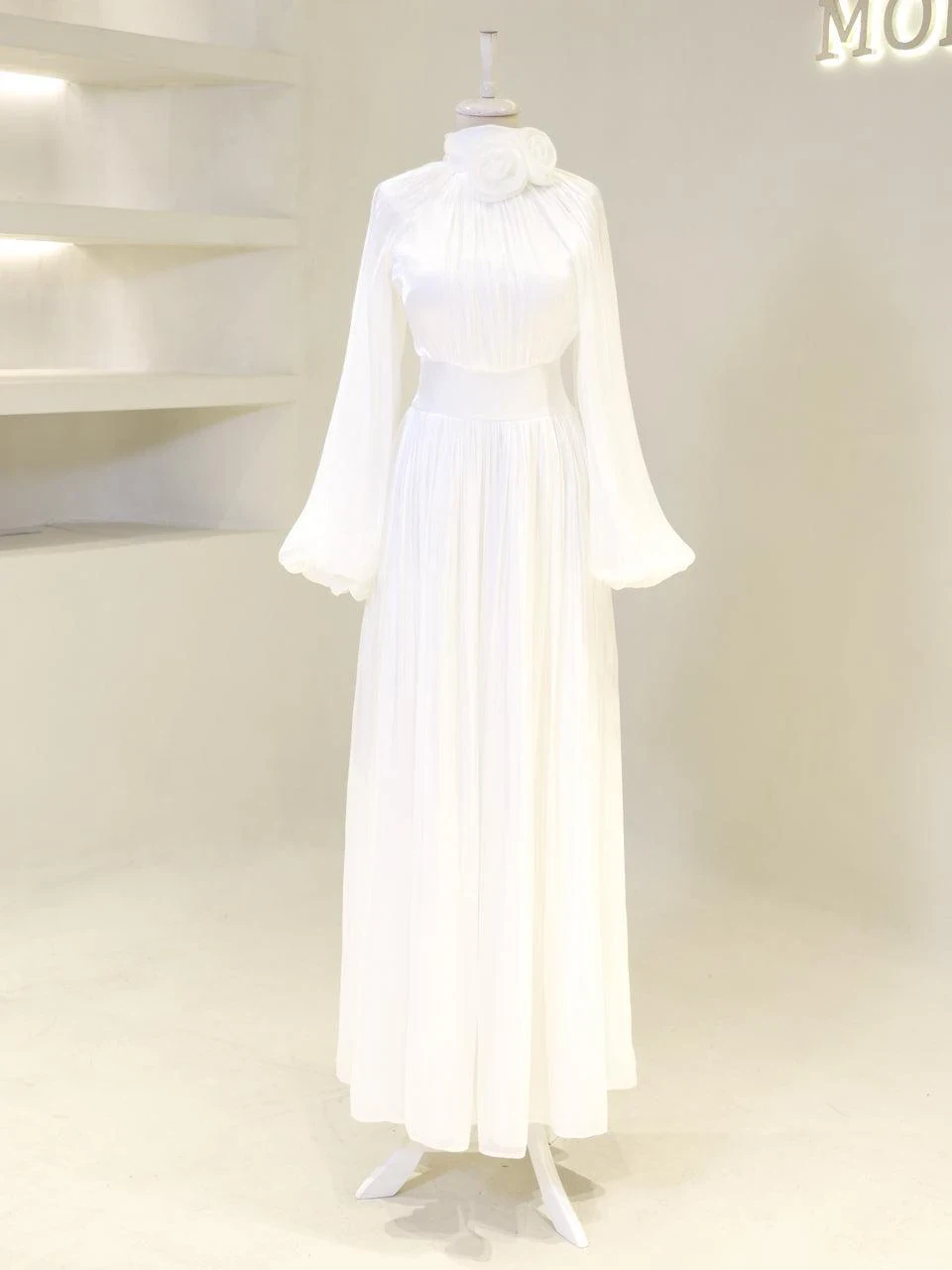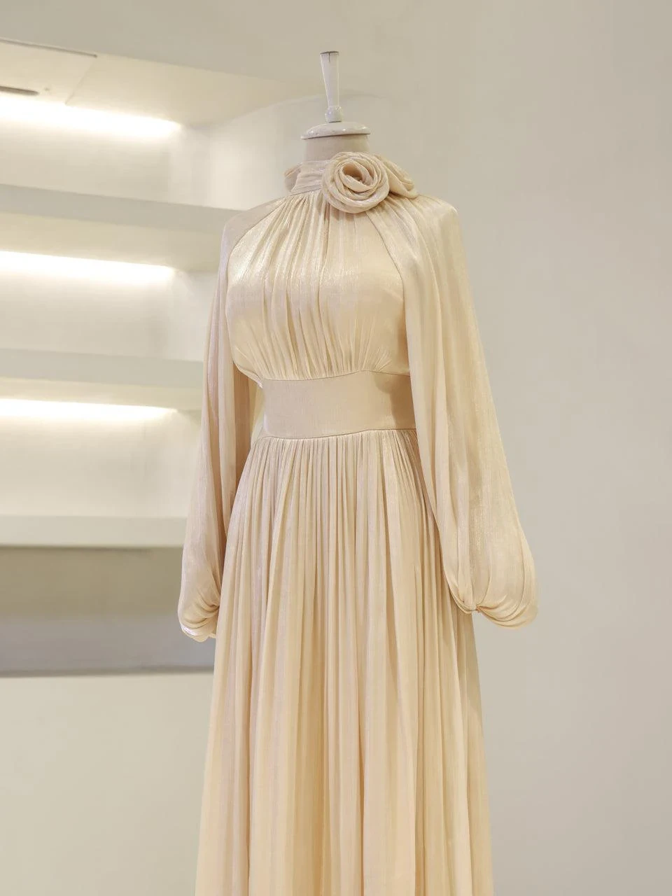The Kavin Modest Evening Dress is designed with a full fit, ensuring comfort and elegance. It features a length of 150 cm and is made from orchid fabric, providing a luxurious feel. The dress is fully lined and includes a back zipper for easy wear. The balloon sleeves add a unique touch, while the detachable brooch detail on the shoulder offers versatility. The pleated skirt design enhances the overall sophisticated look.