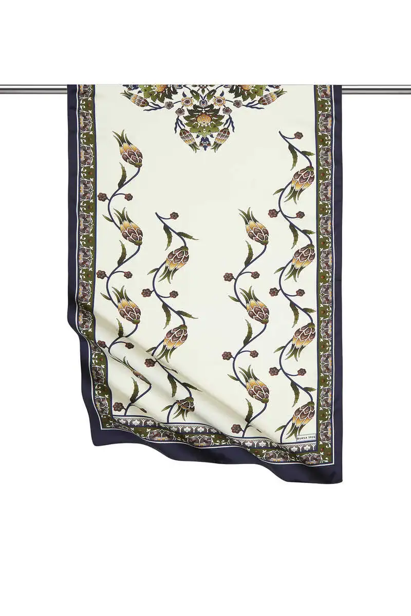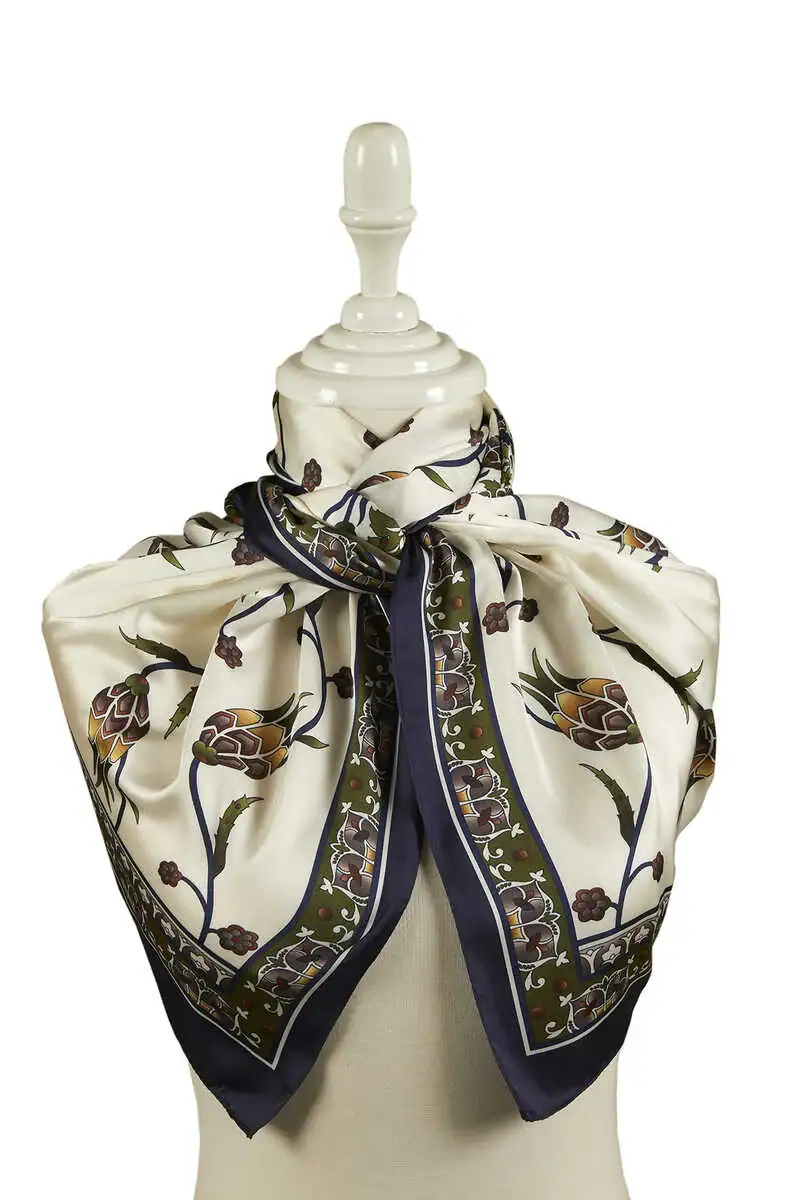 This wide scarf combines khaki and navy tulip patterns with a silky fabric texture, offering a vibrant yet classic look. Crafted from 100% silky rayon, it measures 55×160 cm, providing ease of use. Add energy to your style with the floral design originating from Bursa, Turkey.