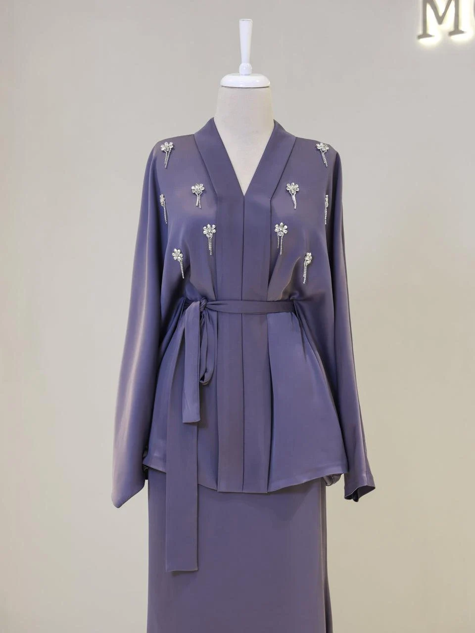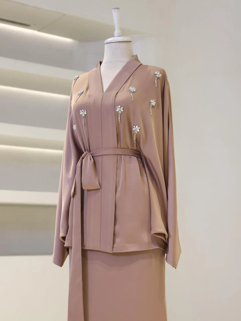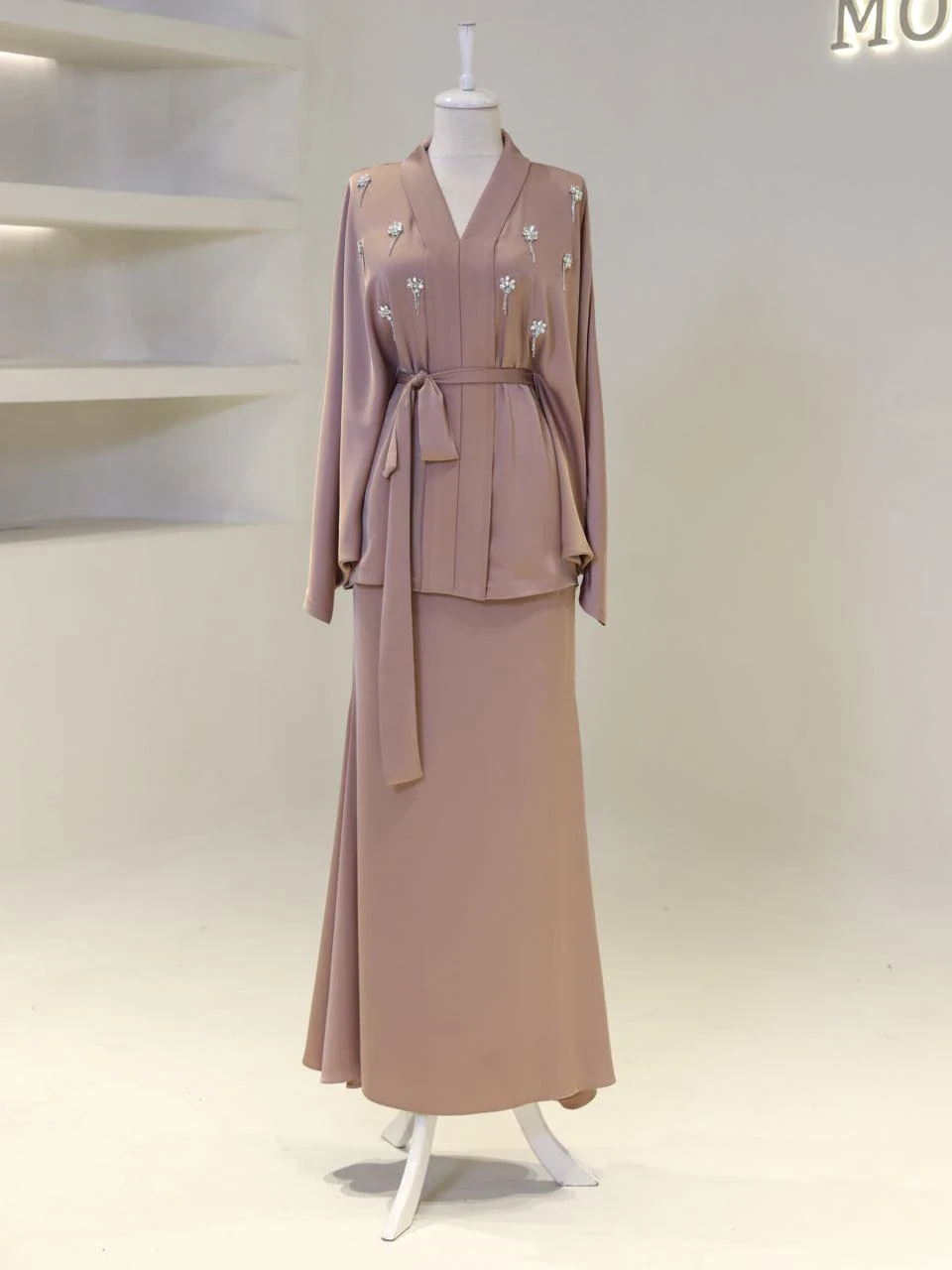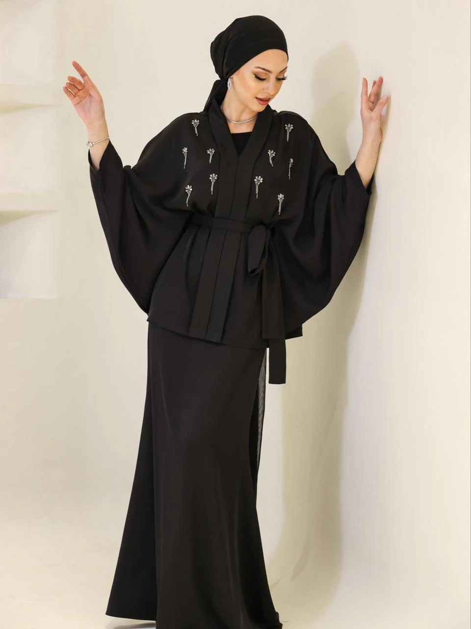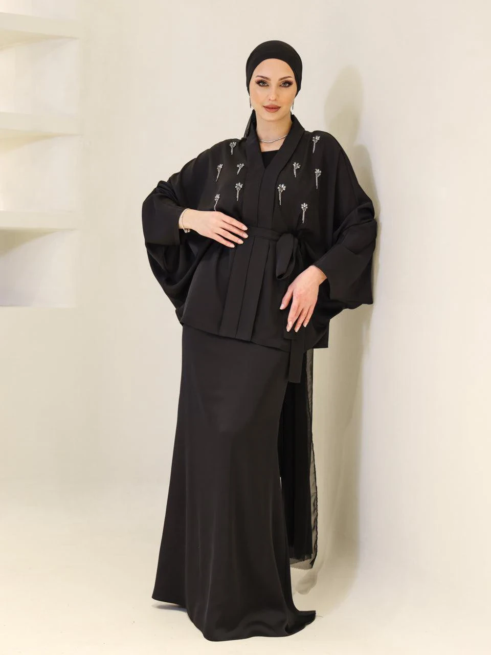 This kimono set is designed with a true-to-size fit. The top measures 70 cm in length, while the skirt is 120 cm long. Made from satin fabric, the skirt includes a lining for added comfort. The design features batwing sleeves and a V-neckline. Embellishments are adhesive, and the set includes a removable belt detail. The skirt has a flared design.