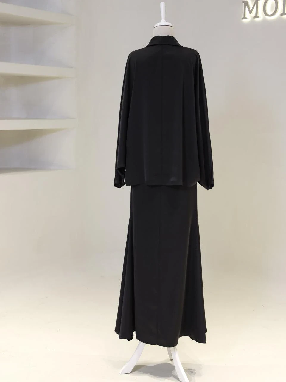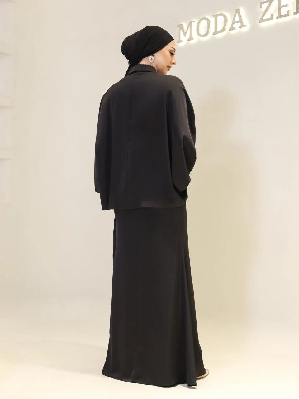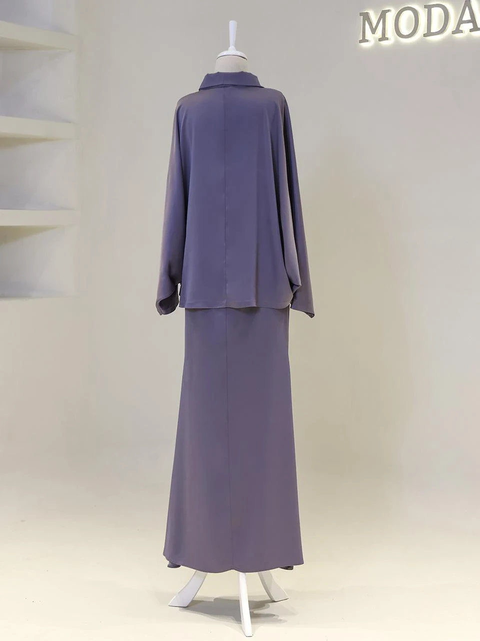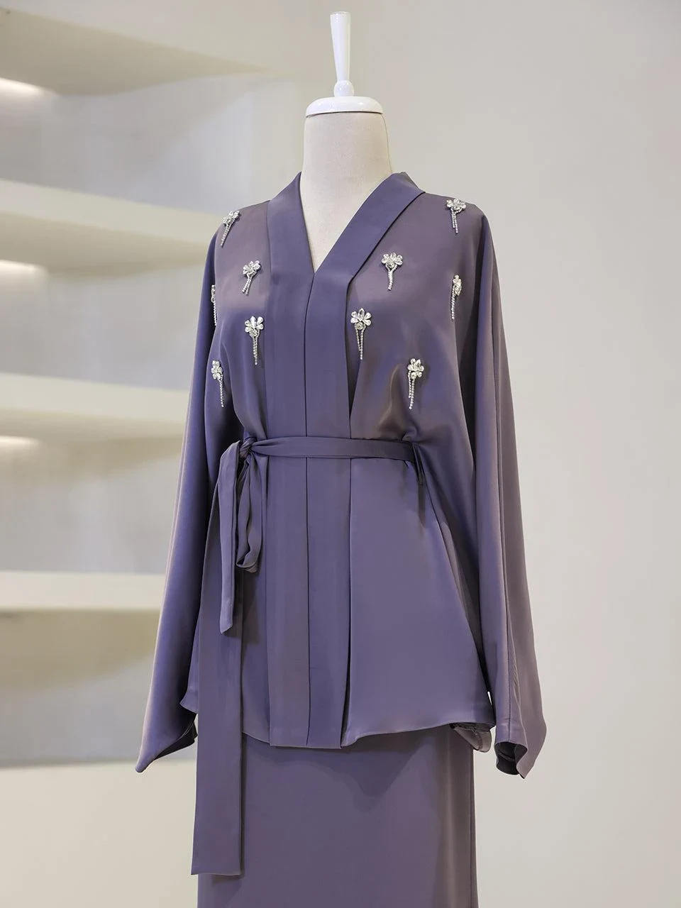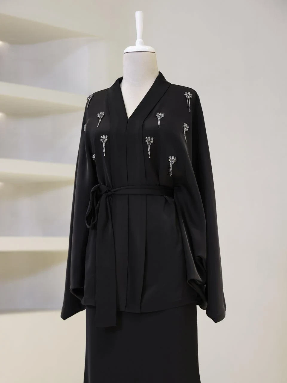 This kimono set is designed with a true-to-size fit. The top measures 70 cm in length, while the skirt is 120 cm long. Made from satin fabric, the skirt includes a lining for added comfort. The design features batwing sleeves and a V-neckline. Embellishments are adhesive, and the set includes a removable belt detail. The skirt has a flared design.