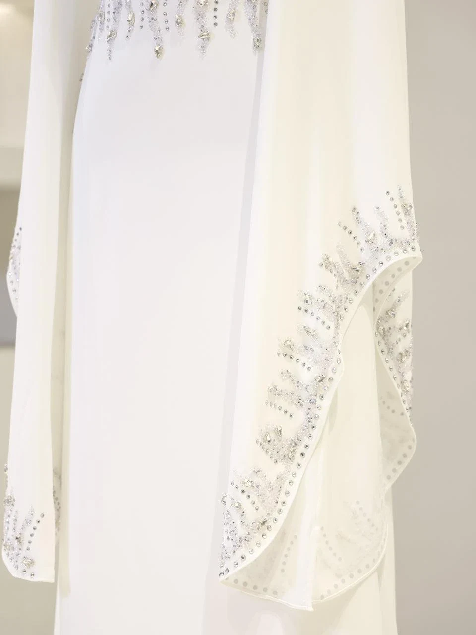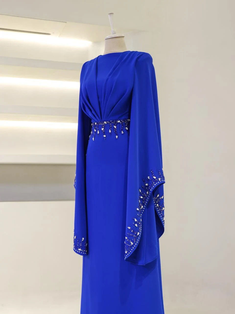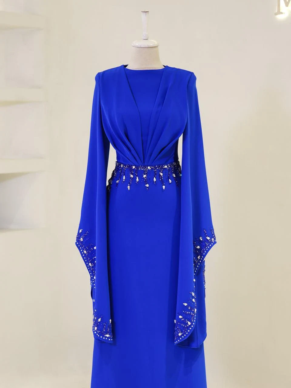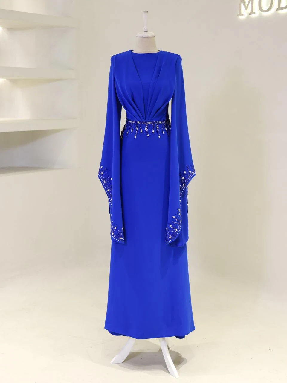 The Lale Modest Evening Dress is designed with a precise fit and an average length of 155 cm. Made from crepe fabric, this dress includes a lining and a back zipper closure. It features a built-in chest pad for added comfort. The embellishments are adhesive, and while there may be some shedding, it will not significantly affect the overall design. The dress showcases Spanish sleeves and a pencil silhouette.