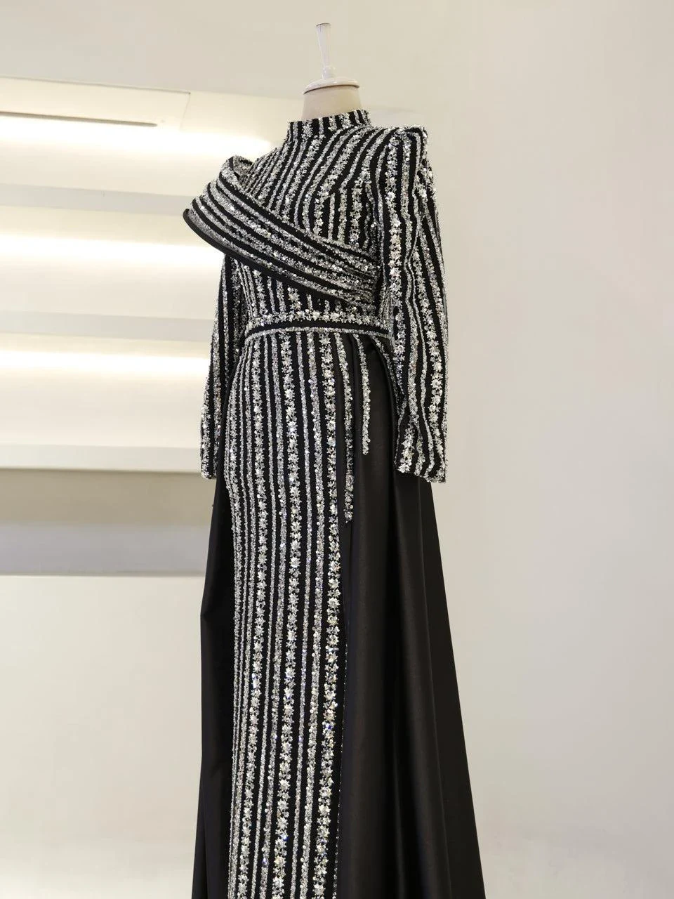 The Lana Modest Evening Dress is designed with a pencil form and provides a full fit. It is crafted from tulle fabric and includes a lining for added comfort. The dress features a detachable cape detail, allowing for versatile styling options. It is equipped with a back zipper for easy wear. The embellishments on the dress are not adhesive, ensuring durability and a high-quality finish.