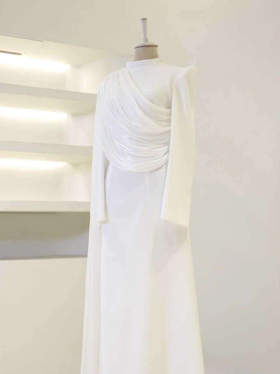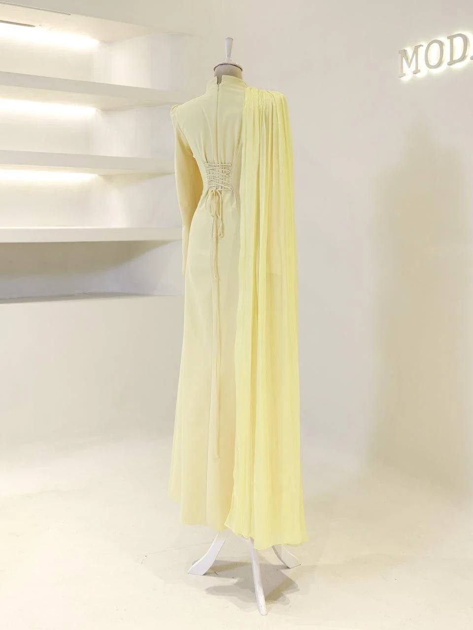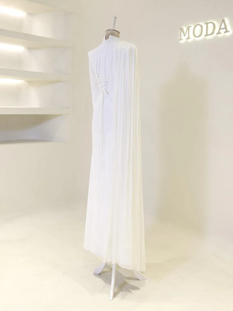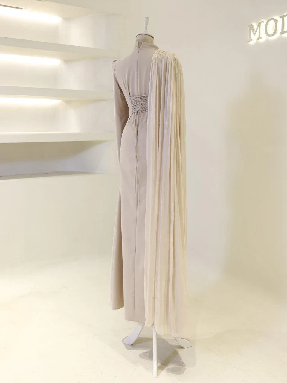 The Leroy Modest Evening Dress is designed with precision to fit true to size. It measures 155 cm in length and is crafted from crepe fabric, providing a smooth and comfortable wear. The dress includes a lining for added comfort and features a back tie and zipper for secure closure. The front of the dress is elegantly draped, and it is highlighted by a cape detail that extends from the right shoulder to the hem. Note that the dress does not include a bust pad and has a flared skirt design.