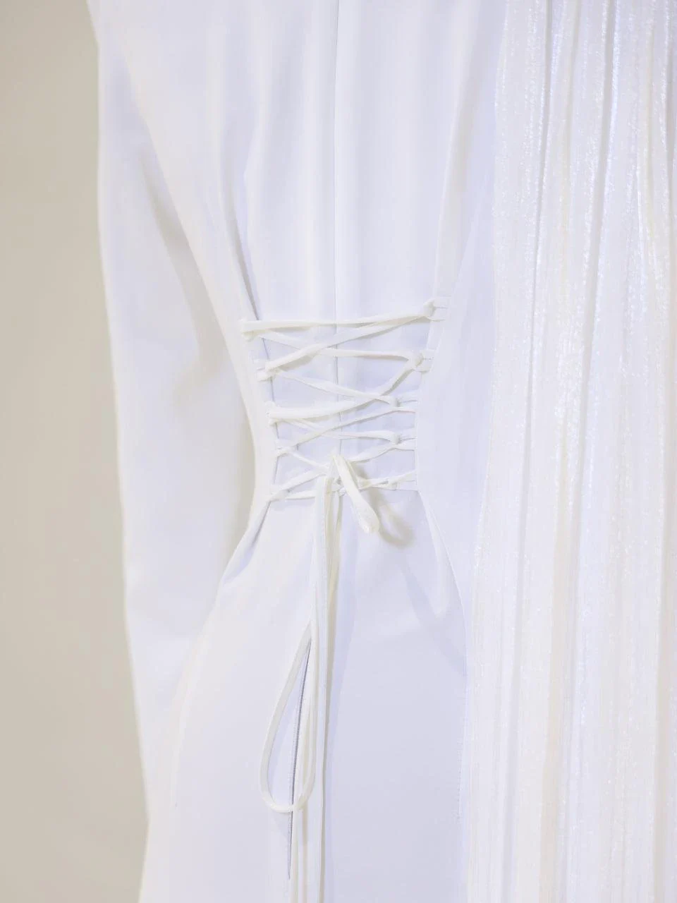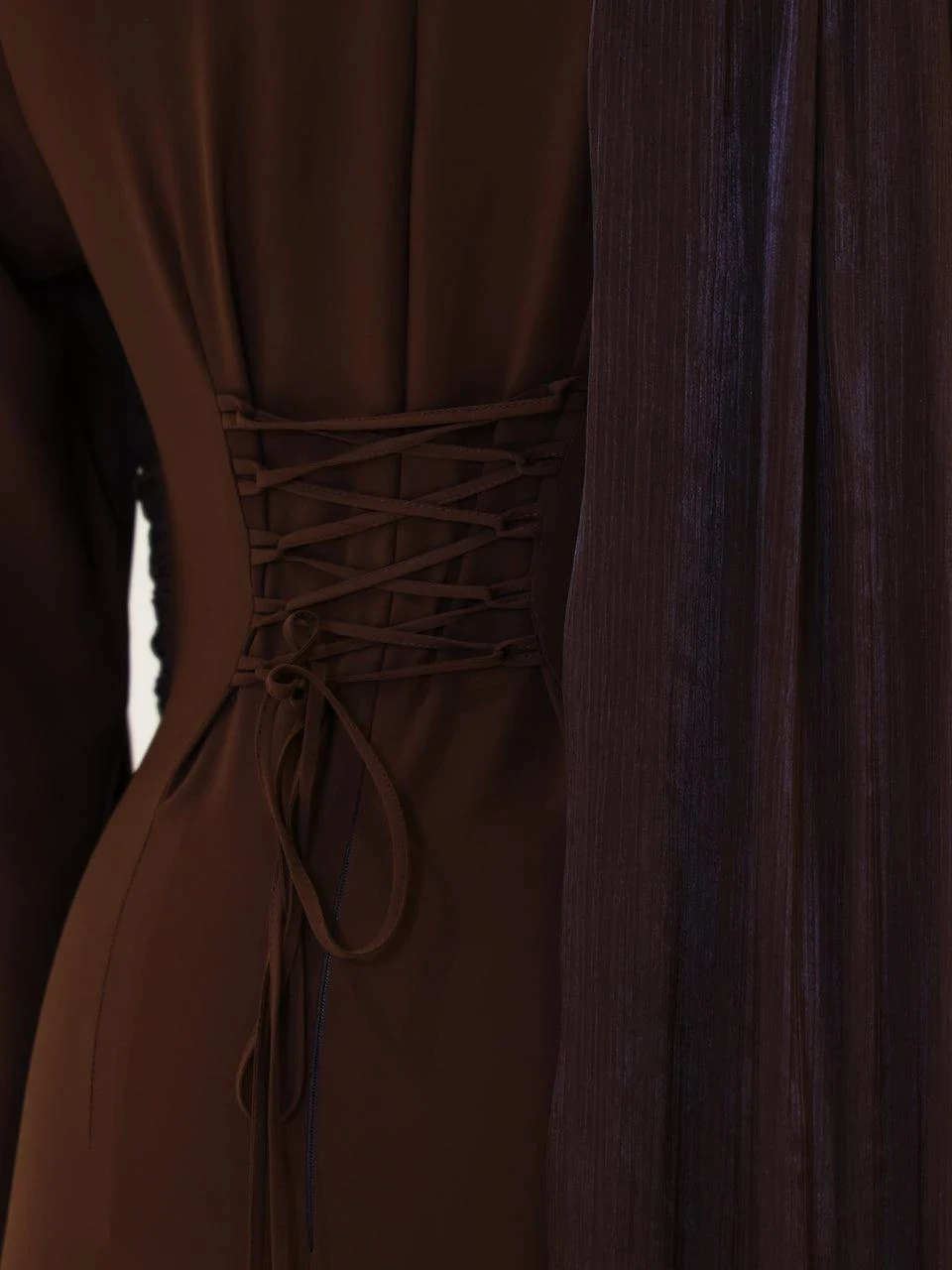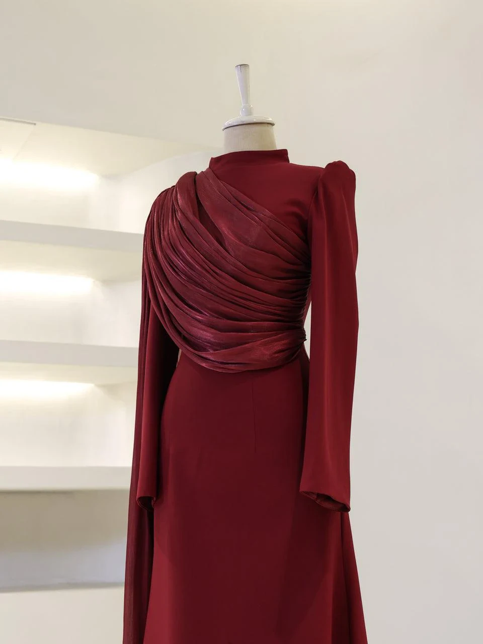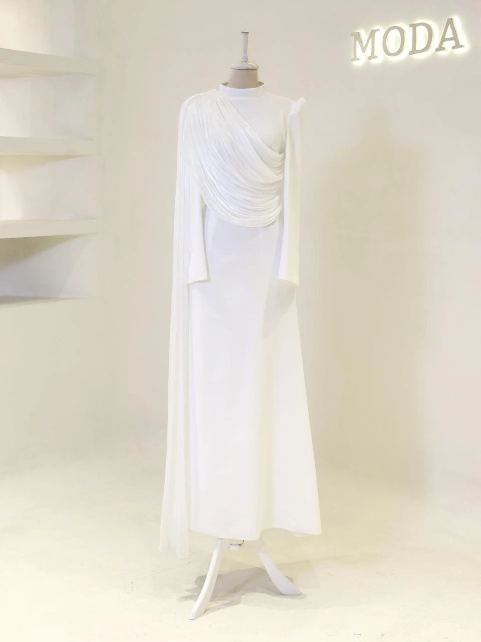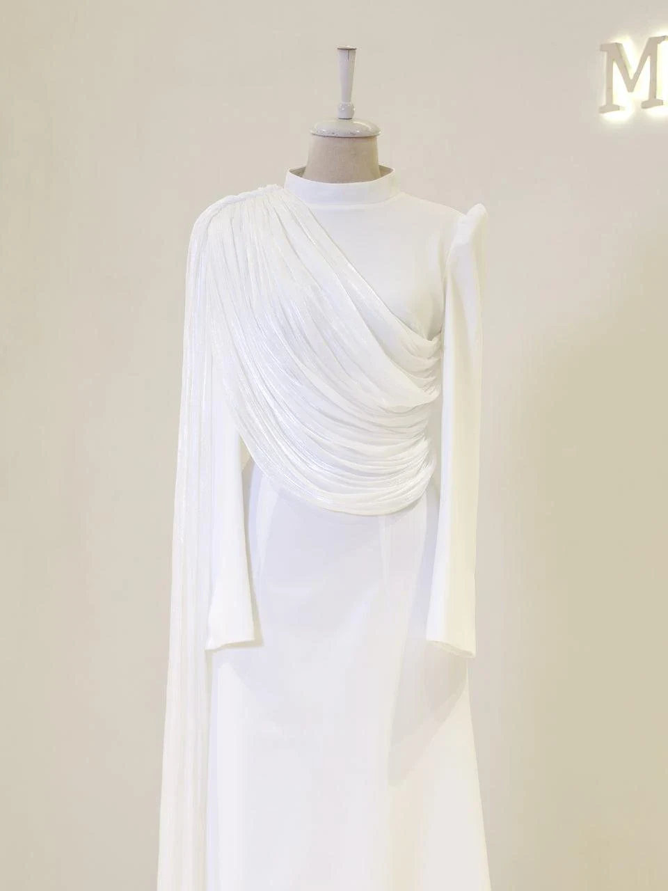 The Leroy Modest Evening Dress is designed with precision to fit true to size. It measures 155 cm in length and is crafted from crepe fabric, providing a smooth and comfortable wear. The dress includes a lining for added comfort and features a back tie and zipper for secure closure. The front of the dress is elegantly draped, and it is highlighted by a cape detail that extends from the right shoulder to the hem. Note that the dress does not include a bust pad and has a flared skirt design.